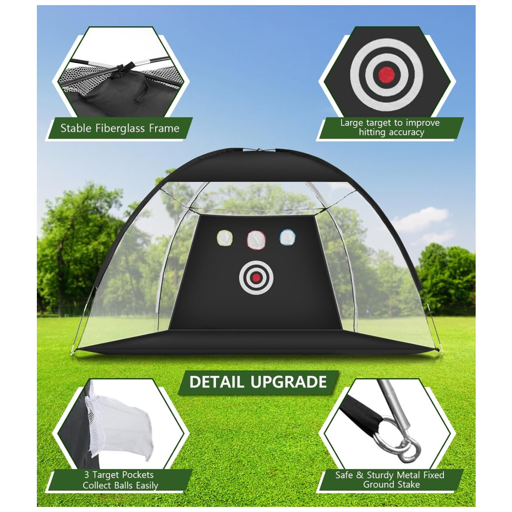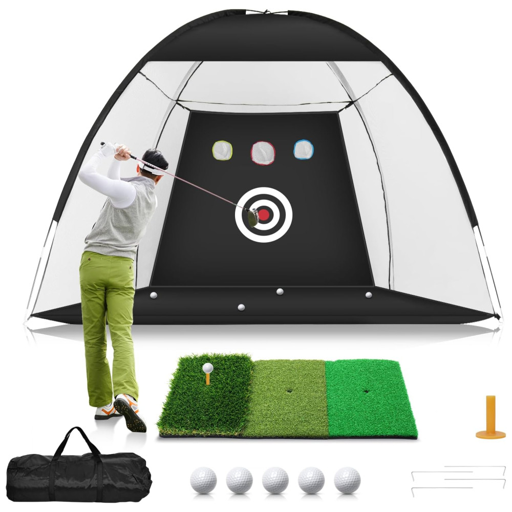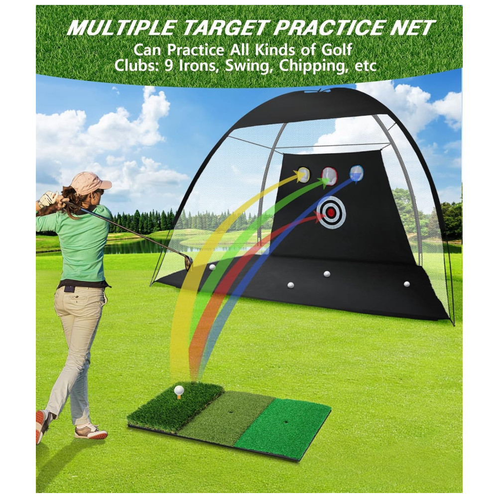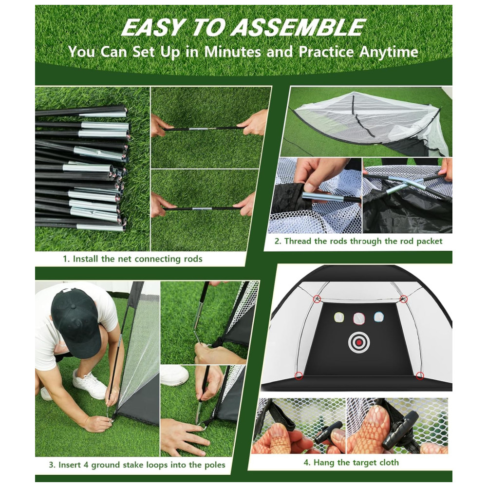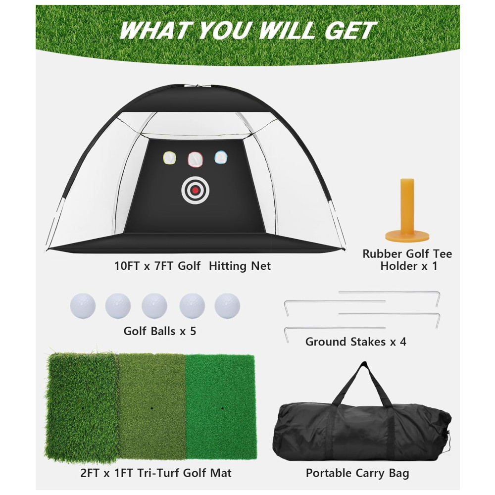 A maneira excepcional de praticar todos os tacos do seu saco de golfe facilmente em casa, ao ar livre, economizando tempo e dinheiro. Um presente prático e atencioso para amantes de golfe masculinos iniciantes. Receba uma rede de golfe, alvo de impacto, tapete TriTurf, 5 bolas de golfe, 5 tees de golfe e uma bolsa de transporte. Nossa rede de treino com tapete é o equipamento ideal para aprimorar suas habilidades de dirigir, fazer swing, aproximar, entre outros. Feita com materiais duráveis, nossa rede suporta velocidades de até 200 mph, proporcionando resistência e desempenho aprimorados. Com várias metas para prática, este kit permite treinar força, precisão e técnica de swing com segurança em qualquer lugar. Fácil de montar e desmontar em 25 minutos, pode ser usado em ambientes internos ou externos, oferecendo diversão e praticidade. Adequado para todas as idades, sem restrições de tempo ou local para praticar golfe. Libere sua paixão pelo esporte onde e quando quiser!