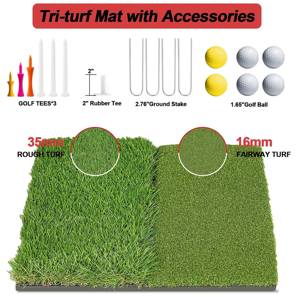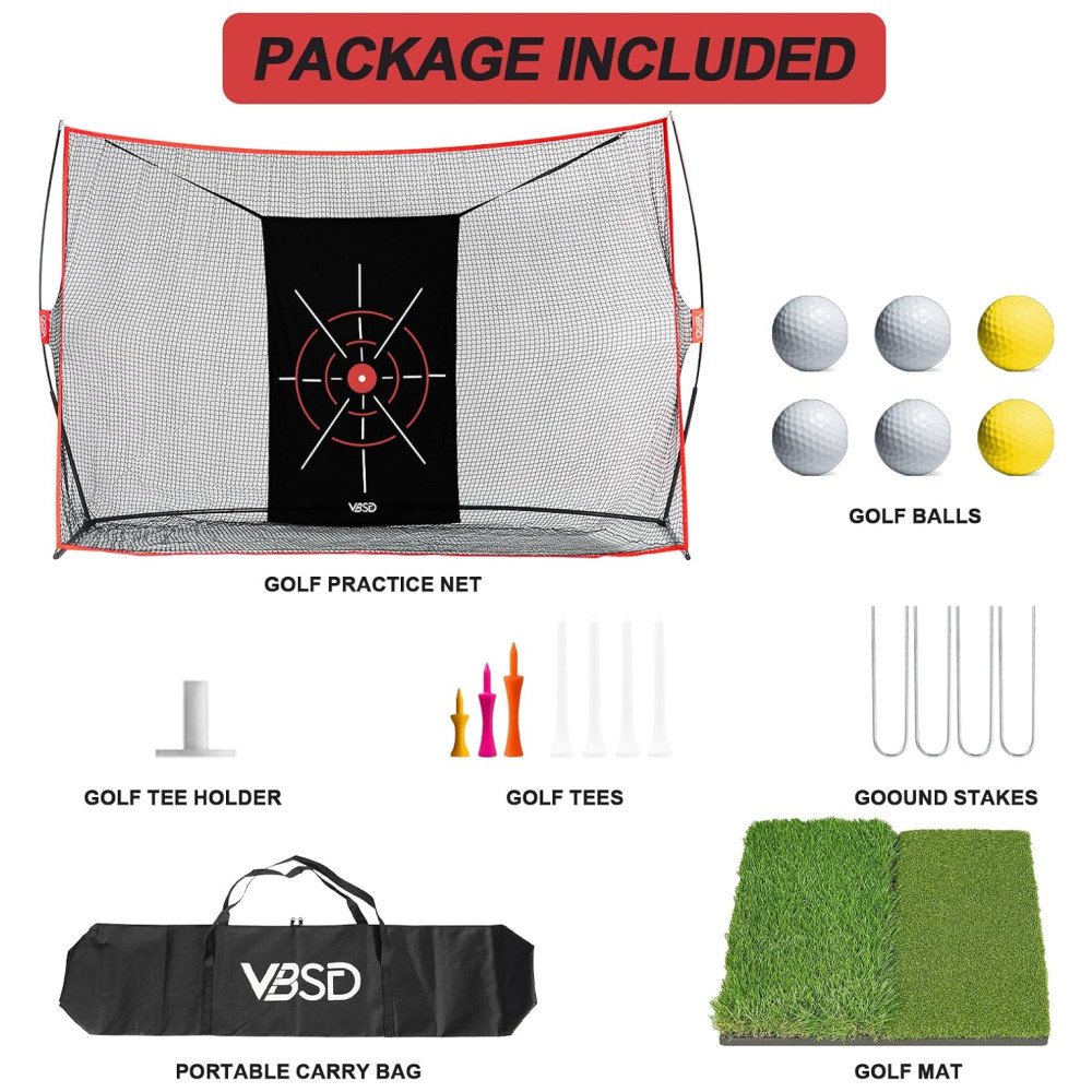Componentes Inclusos: Rede de Golfe 10x7ft, 1 rede de chipagem com 3 zonas-alvo, Tapete de Golfe 2 em 1, 6 bolas de golfe PU, 7 tees de golfe, 1 tee de borracha, 4 estacas, 1 bolsa de transporte