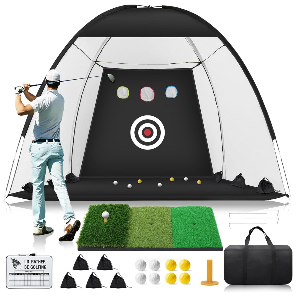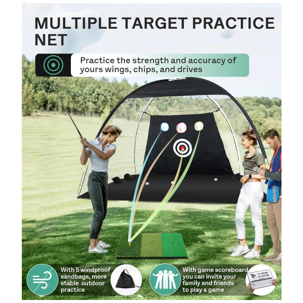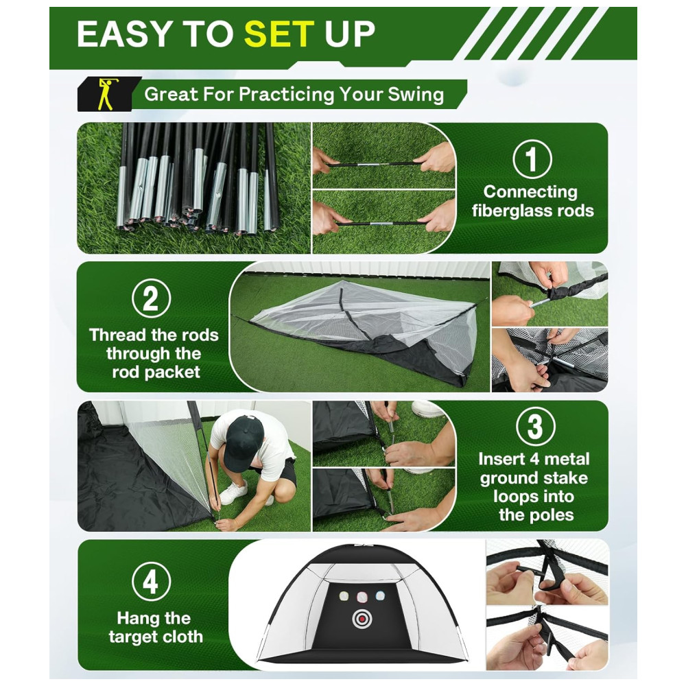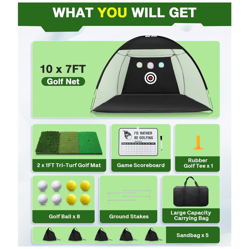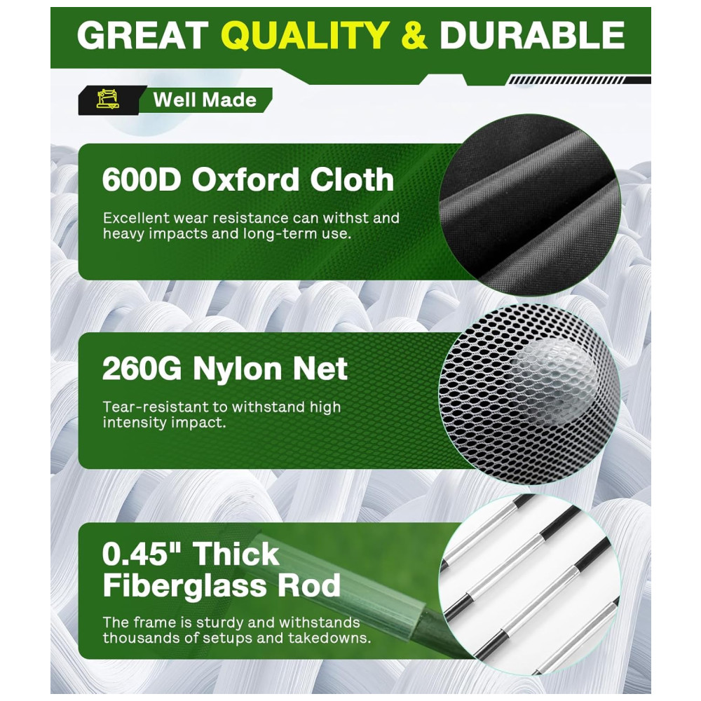 Transforme seu quintal em um campo de golfe com a Rede de Golfe All-in-One, que inclui uma rede de 3X2,1 m, um tapete de golfe TriTurf dobrável, um placar, sacos de areia à prova de vento, tee de golfe, bolas de golfe e PU, estacas e bolsa de transporte. Feita com tecido Oxford 600D de alta qualidade e rede de nylon absorvente de choque de 260G, proporcionando durabilidade e resistência a impactos. Com estrutura de fibra de vidro, a rede se mantém firme para prática em qualquer superfície. O amplo espaço e os alvos múltiplos aprimoram suas habilidades de tacadas e chipping. O placar permite competições divertidas em família. Fácil de montar e desmontar, permitindo treinos em qualquer lugar, seja interno ou externo. Jogue golfe a qualquer hora, em qualquer lugar, seja no quintal, na sala de estar ou no porão. Adequado para todas as idades e níveis de habilidade, sendo o equipamento perfeito para amantes do golfe.