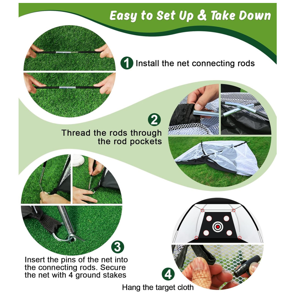 Componentes Inclusos: Rede de golfe , tapete de golfe , 4 estacas, 5 bolas de golfe, tee de golfe, bolsa portátil