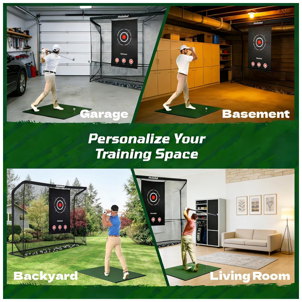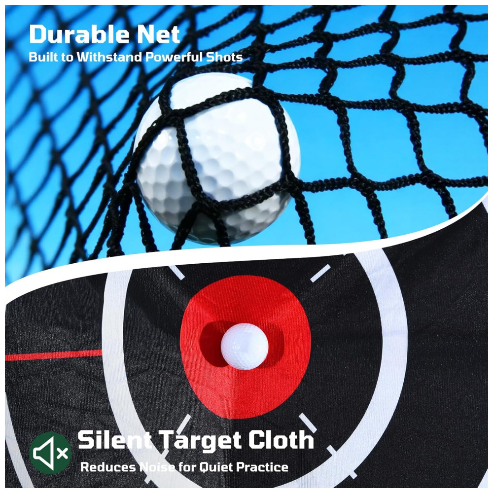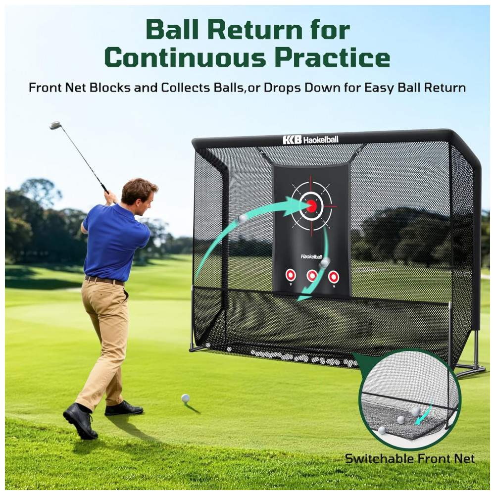 Aprimore sua técnica de golfe com a Rede de Treino de Golfe da Haokelball. Com um sistema de coleta de bolas que mantém todas as bolas seguras após cada tacada, você economiza tempo de busca e foca no treino. O alvo de tamanho grande reduz o ruído em 50%, oferecendo durabilidade ao resistir aos impactos das bolas de golfe reais. Construída com estrutura de aço revestido a pó e rede de alta tensão, esta rede suporta treinos intensos. Fácil de montar e transportar, ideal para uso em diversos espaços, seja garagem, quintal ou ambientes internos.