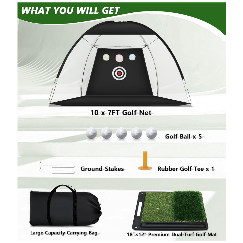 A rede é acompanhada por um tapete de golfe DualTurf com base de borracha resistente de 45,72 cm x 30,48 cm, 5 bolas de golfe, 1 camiseta de borracha, 1 bolsa de transporte de grande capacidade e 4 estacas de solo. A estrutura resistente de fibra de vidro de 0,45 diâmetro protege a rede, permitindo que ela fique firme no chão mesmo em condições de vento.