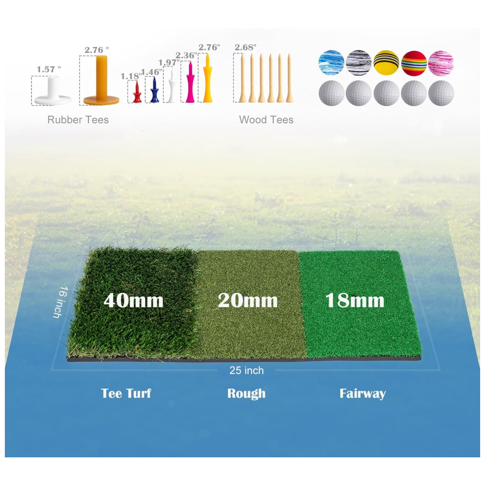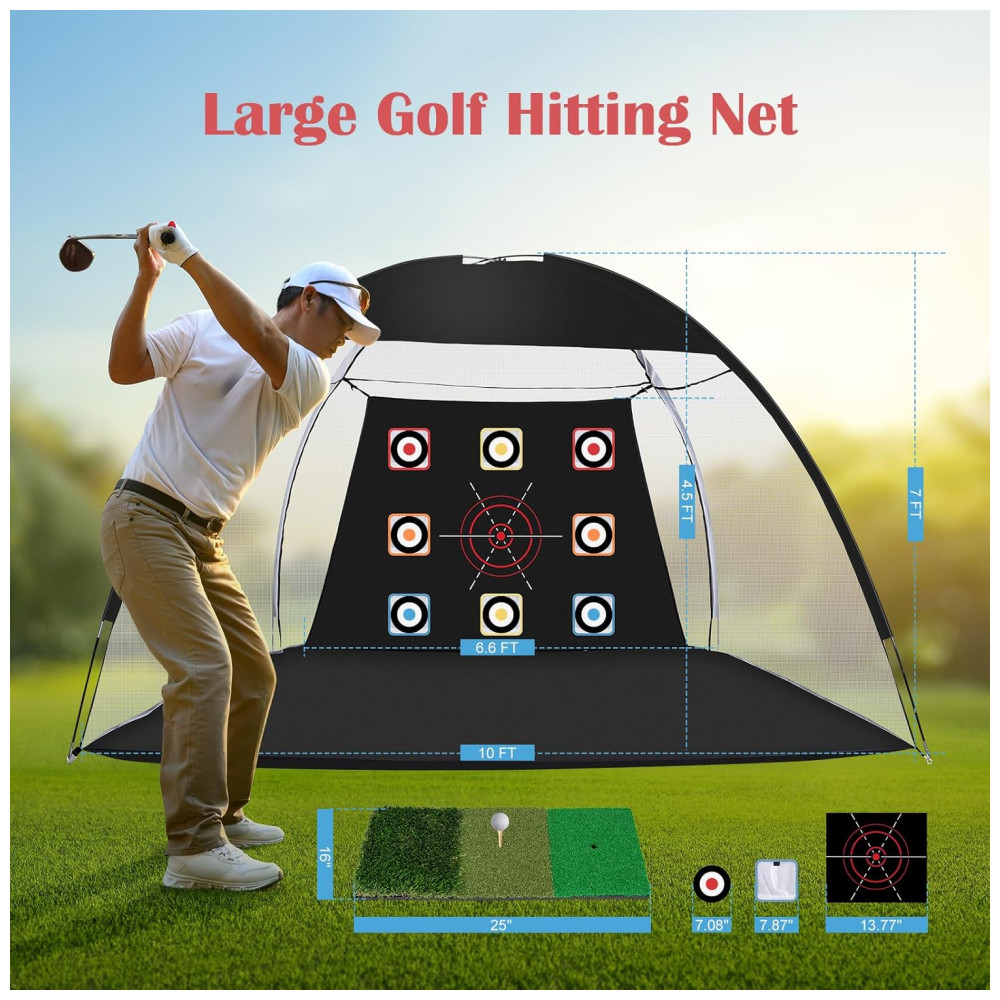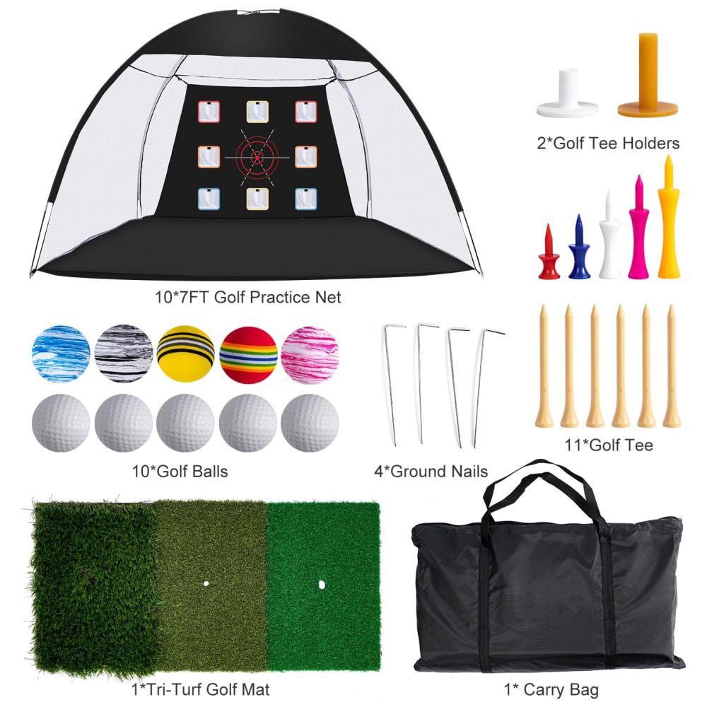 O conjunto de rede de rebatidas de golfe inclui um tapete de rebatidas de 2 x 0,3 metros, 10 bolas de golfe PU, 11 camisetas de golfe (sendo 2 de borracha) e uma bolsa de transporte. Com esses acessórios completos, você tem tudo o que precisa para praticar golfe em qualquer lugar e a qualquer hora, com custo reduzido.