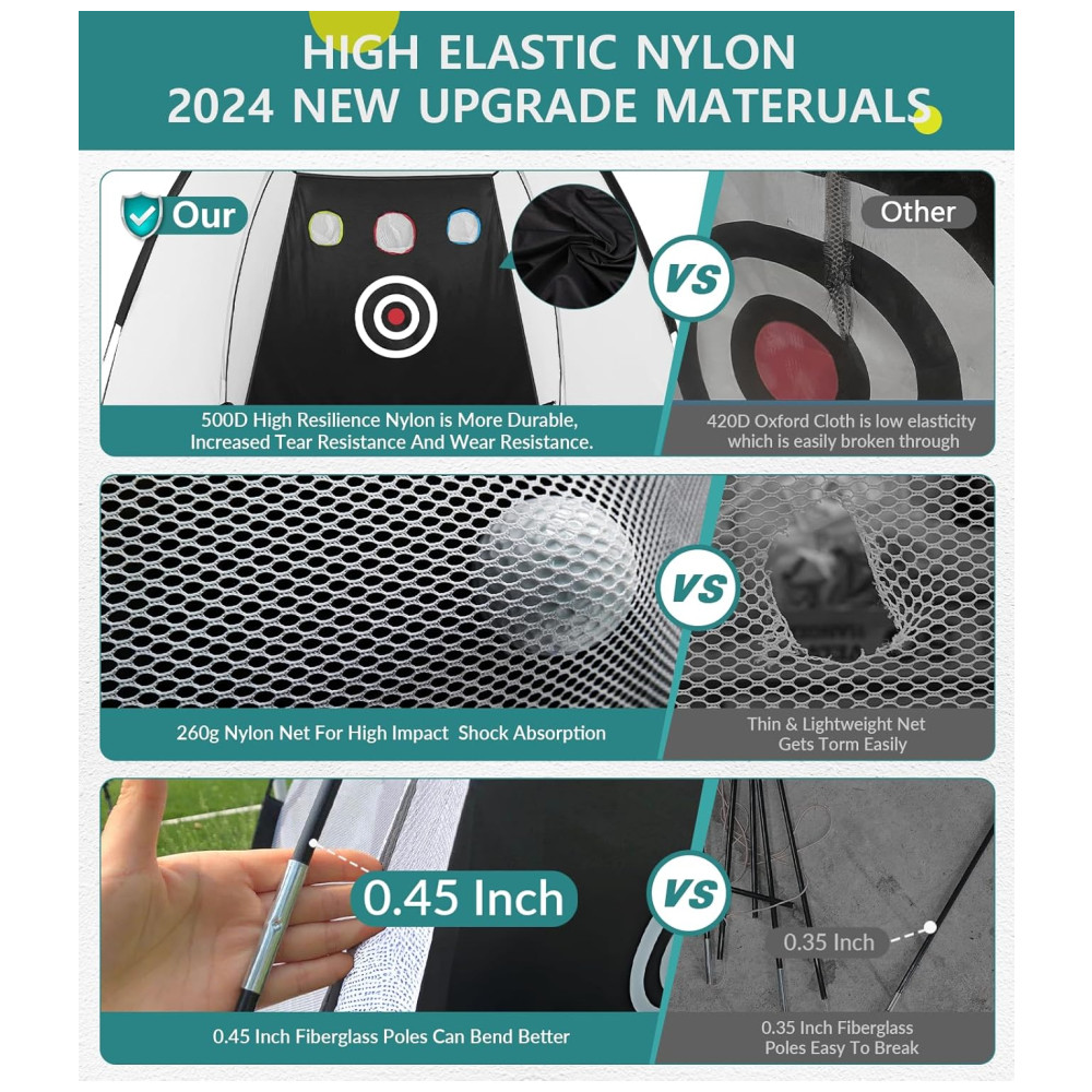 Cuidadosamente elaborada por especialistas em golfe experientes, a rede utiliza materiais recém-atualizados, incluindo uma rede de náilon de 260g que suporta disparos fortes sem desgaste. O tecido de náilon de alta elasticidade 500D é durável e resistente ao desgaste, reduzindo eficazmente o ruído, sendo amigável para animais de estimação, vizinhos e crianças. A haste de fibra de vidro de 1 cm é flexível e o design atualizado da rede de chipping proporciona durabilidade superior.