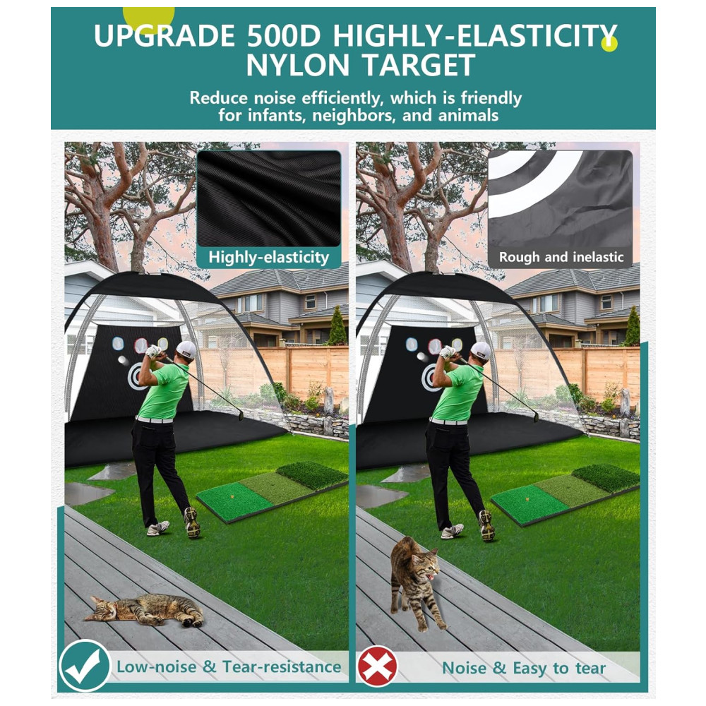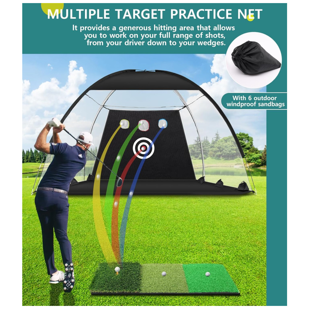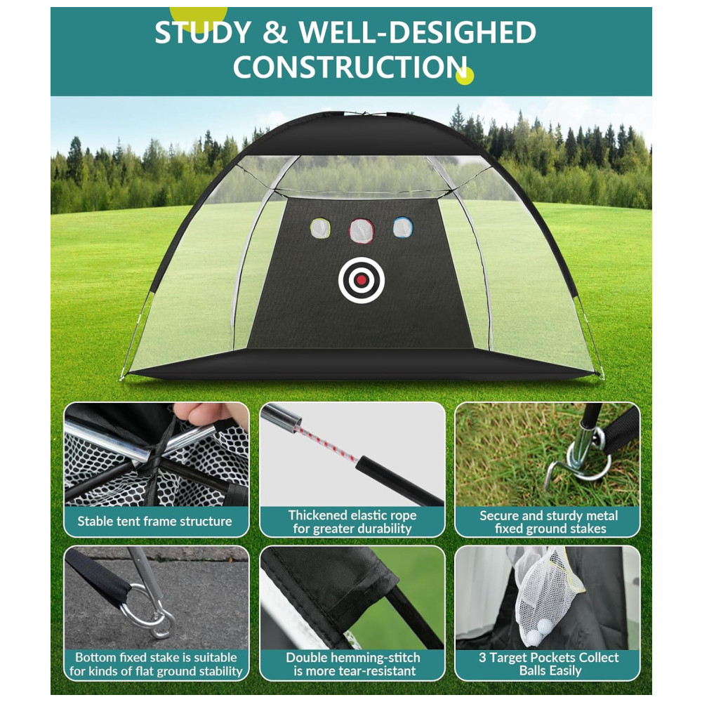 A Rede de Golfe 3m x 2,1m oferece amplo espaço para praticar um swing completo, permitindo que você bata na bola com confiança. Seja você um jogador iniciante, intermediário ou avançado, o grande alvo ajuda a aprimorar habilidades básicas, enquanto os três pequenos alvos facilitam o refinamento e a precisão.
