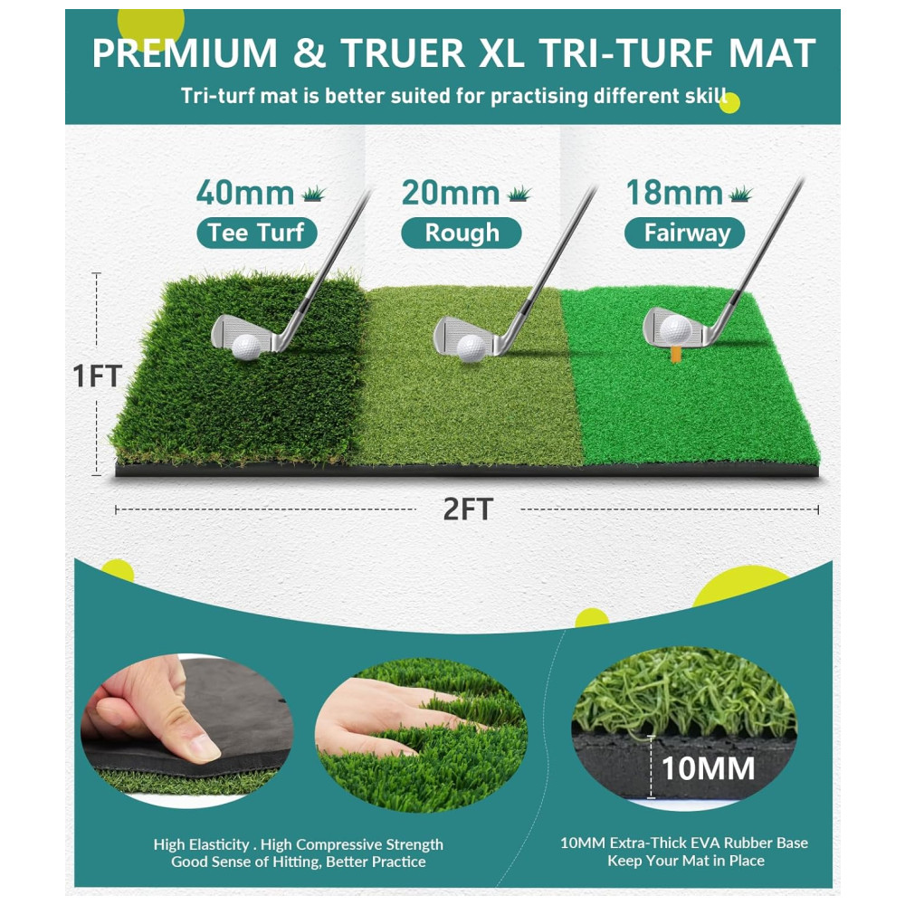 Tanto para uso indoor quanto outdoor, esta rede de prática de golfe proporciona uma experiência realista semelhante a um campo de golfe real. O Tapete de Golfe Multifuncional 3 em 1 oferece três comprimentos diferentes de grama para prática de swing, chipping e putting, garantindo uma experiência de rebatida realista. A parte inferior em PVC antiderrapante proporciona melhor aderência ao solo, evitando escorregões durante a prática e protegendo seu taco.