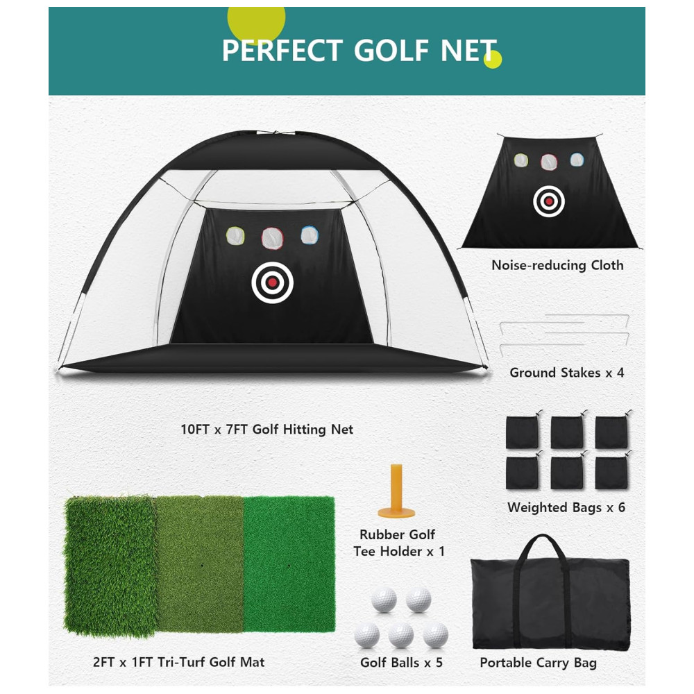 A construção robusta e bem projetada torna esta rede de prática de golfe um presente ideal para entusiastas do golfe. O pacote inclui: Rede de Golfe 3m x 2,1m, Pano Redutor de Ruído, 6 Sacos de Areia, 2 Tapetes de Prática de Golfe 3 em 1, Base de Borracha, 5 Bolas de Golfe e 4 Estacas de Fixação.