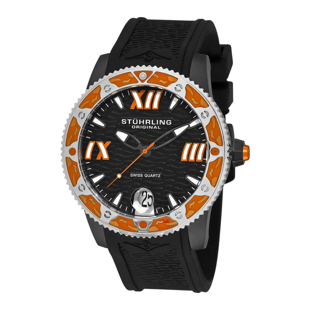 Este relógio apresenta um tamanho de 47 mm e é resistente à água com capacidade de até 100 metros ou 330 pés. Sua moldura possui um padrão de onda em relevo e a pulseira é feita de borracha de silicone com um padrão de onda e o logotipo Stuhrling Wings, tendo uma largura de 24 mm.