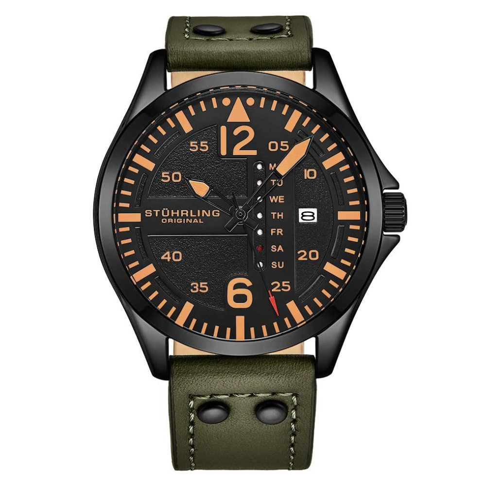 Relgio Aeronaut 3916 Aviador 43mm Mostrador Preto Pulseira de Couro Fivela Tang Stuhrling