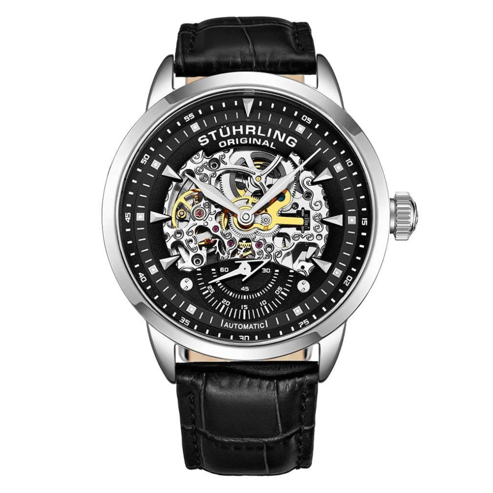 Relgio Automtico Executive 3133 44mm Mostrador Preto e Prata Pulseira de Couro Preta e Fivela Tang de Prata – Stuhrling.
