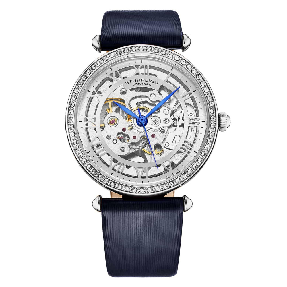 Relógio Automático Stuhrling Luxe 4022 38mm Prateado com Detalhes Azuis e Mostrador Prateado