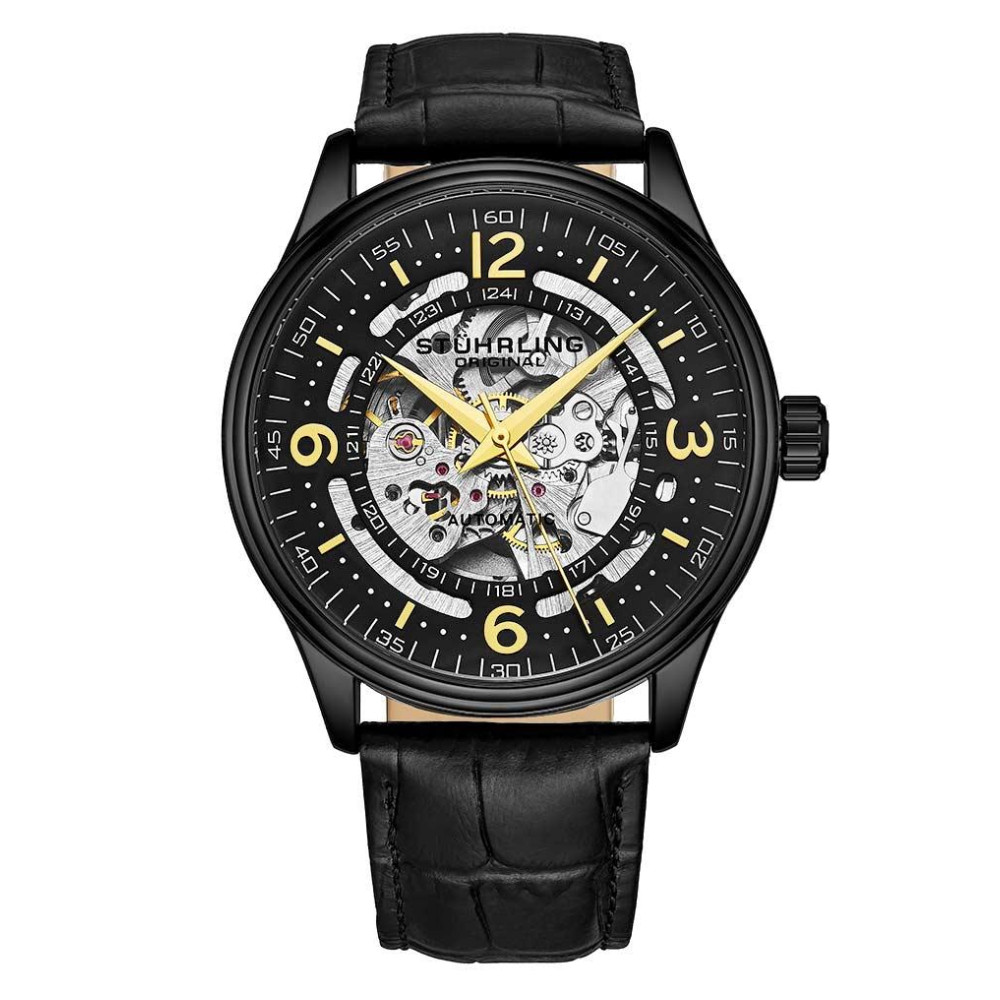 Relgio Automtico Stuhrling Dinamarca 3947 42mm Mostrador Preto Pulseira de Couro Preto com Fivela Tang Preta