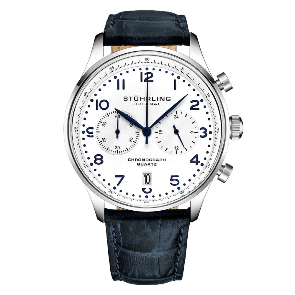 Relógio Cronógrafo Stuhrling GR1Q 4012 42mm Mostrador Branco Pulseira Couro Azul Fivela Prata