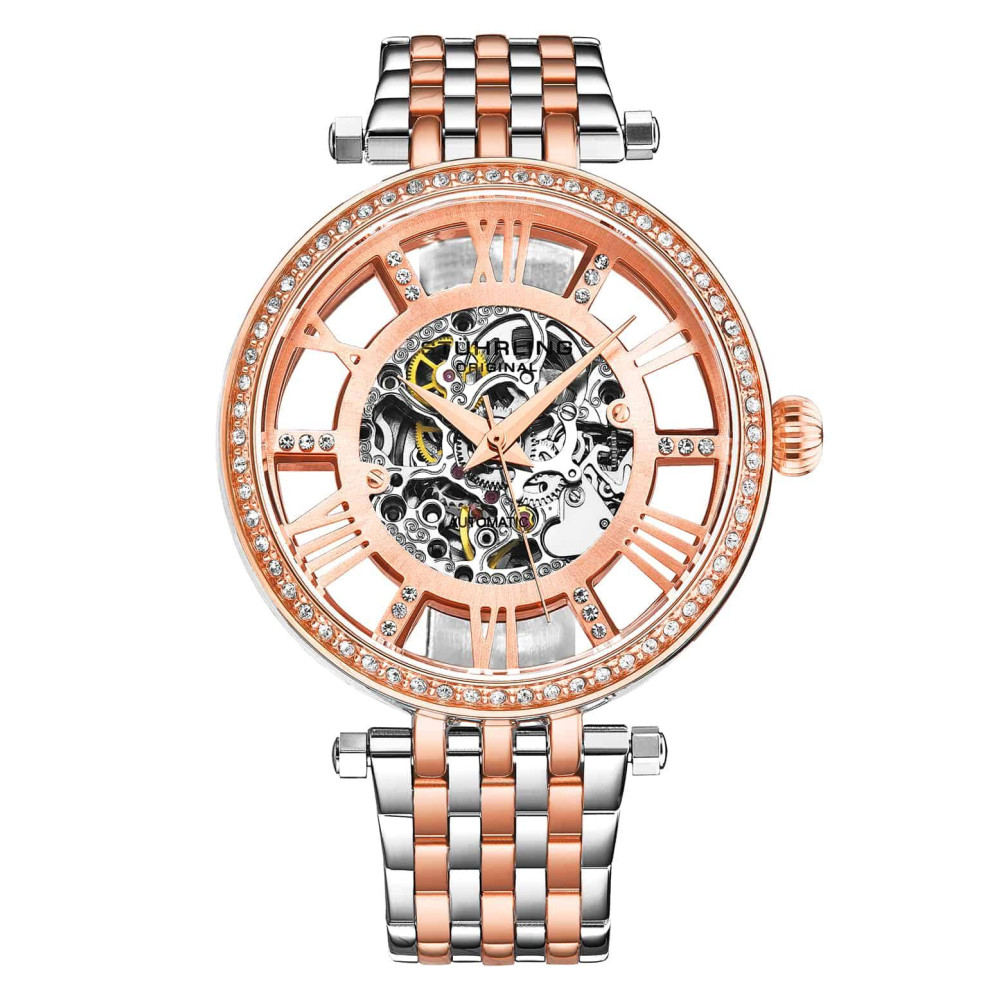 Relógio Automático Stuhrling Delphi 38mm Rosa e Prata Pulseira Aço Inoxidável Prateada com Fivela Rosa