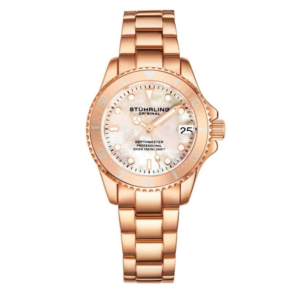 Relgio Depthmaster 3950L 32mm com mostrador branco e rosa pulseira de ao inoxidvel rosa e fivela de implantao – Stuhrling.