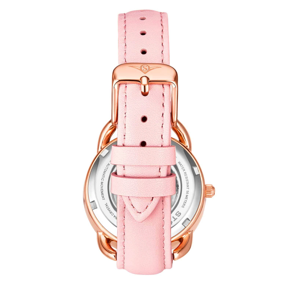 Relgio Feminino Stuhrling 3990 Automtico 36mm Mostrador Rosa e Pulseira de Couro Rosa com Fivela Tang em Camadas de Ouro Rosa
