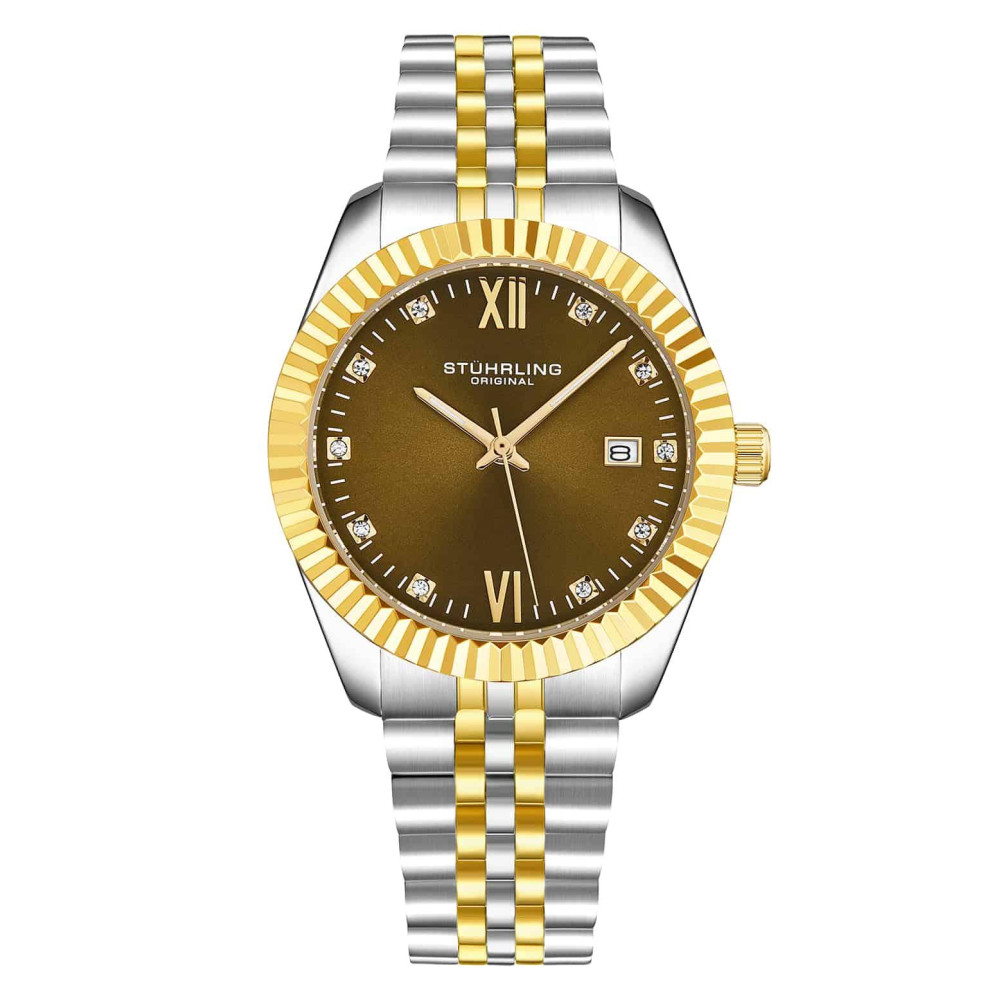 Relgio Gamine Classic 42mm 4024 com mostrador marrom e pulseira em dois tons amarelo prateado da marca Stuhrling
