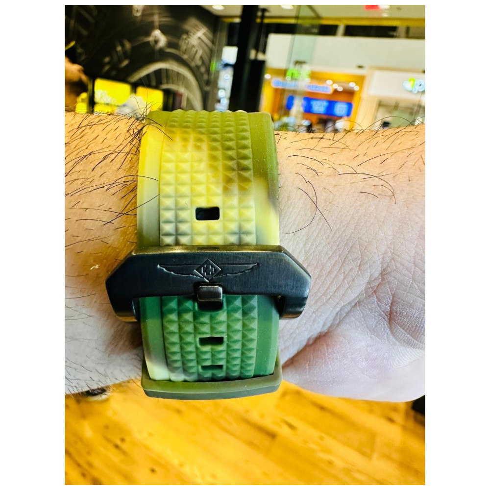 Este incrível relógio Invicta da coleção Aviator oferece um movimento preciso, com uma impressionante caixa de metal. O mostrador apresenta um acabamento em metal verde, protegido pelo exclusivo cristal Flame Fusion. O design é complementado por uma pulseira de silicone com estampa camuflada. Este relógio é resistente à água em até 100 metros.