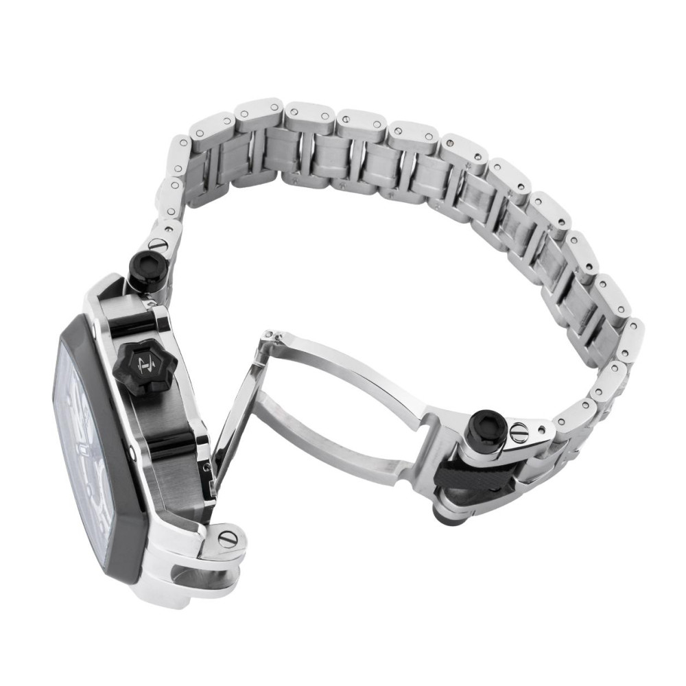Seu mostrador exibe um mostrador prateado, esqueltico e metlico protegido por um cristal Flame Fusion altamente resistente.