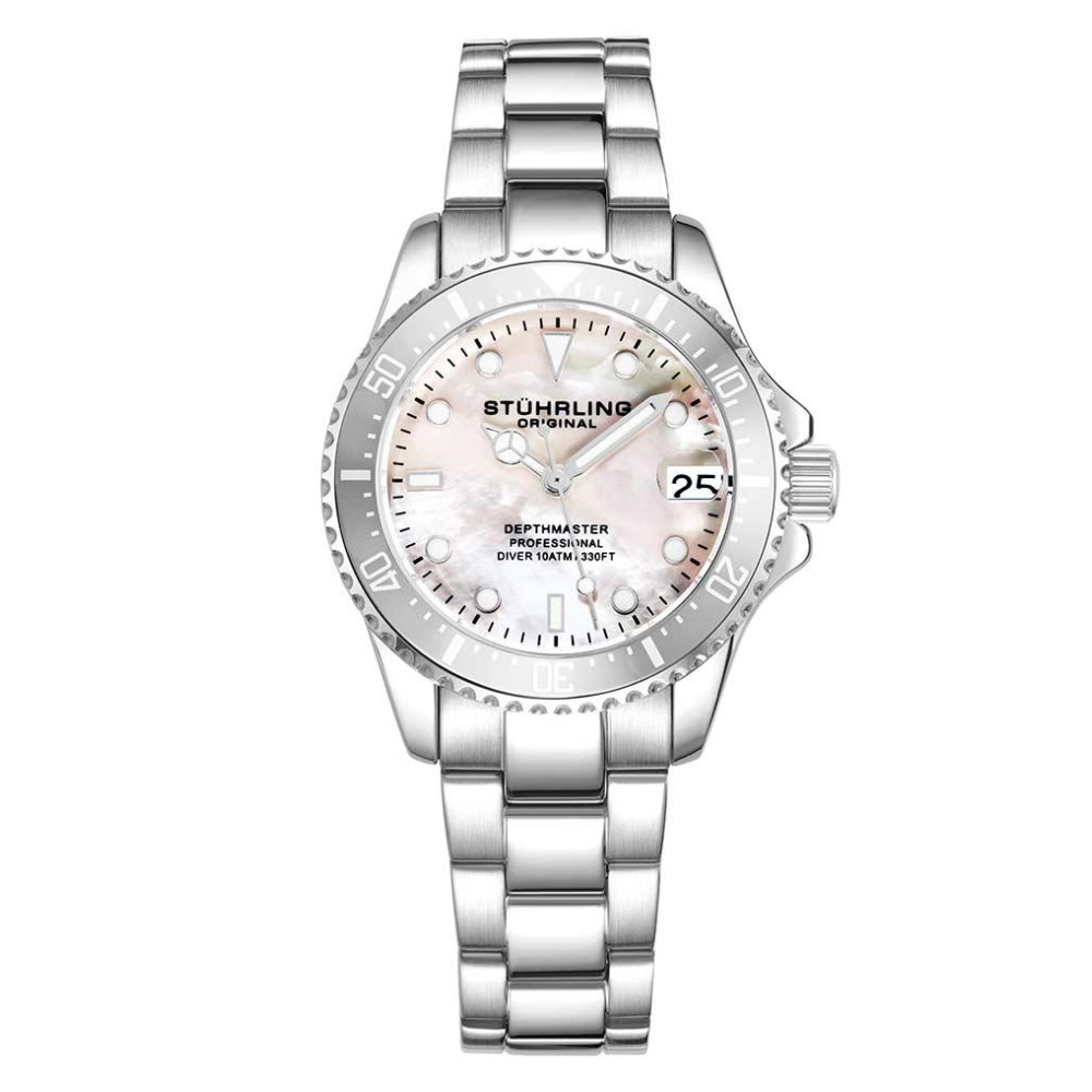 Relgio masculino Depthmaster 3950L 32mm mostrador branco e pulseira de ao inoxidvel prata Stuhrling.