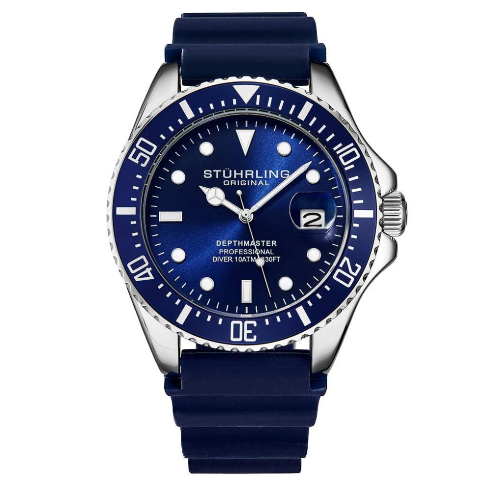Relgio masculino Depthmaster 3950R 42mm mostrador azul pulseira de borracha azul e fivela de prata – Stuhrling.