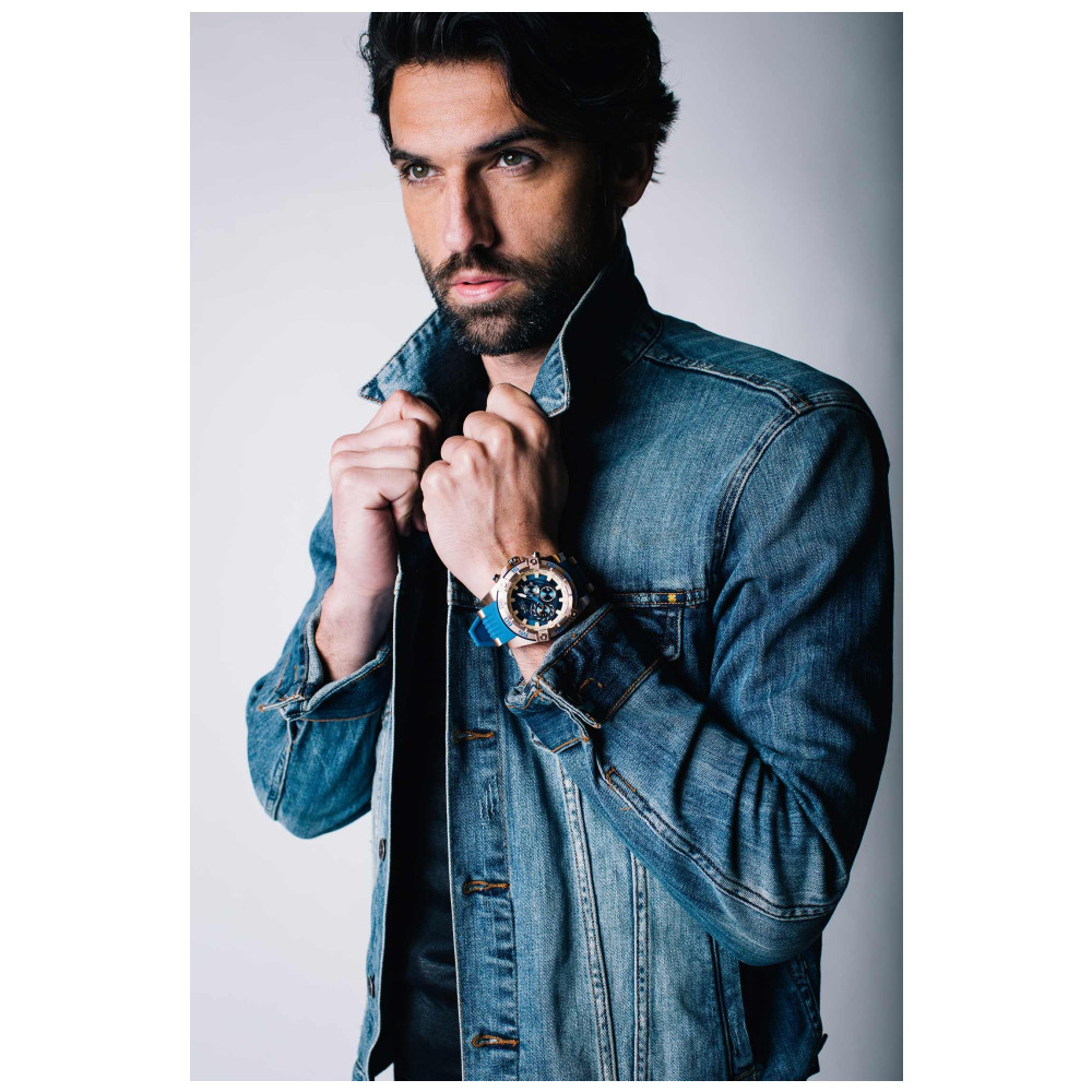 Este relgio finalizado com uma forte pulseira de silicone em ouro rosa, azul, ao inoxidvel e oferece resistncia gua de 100 m.