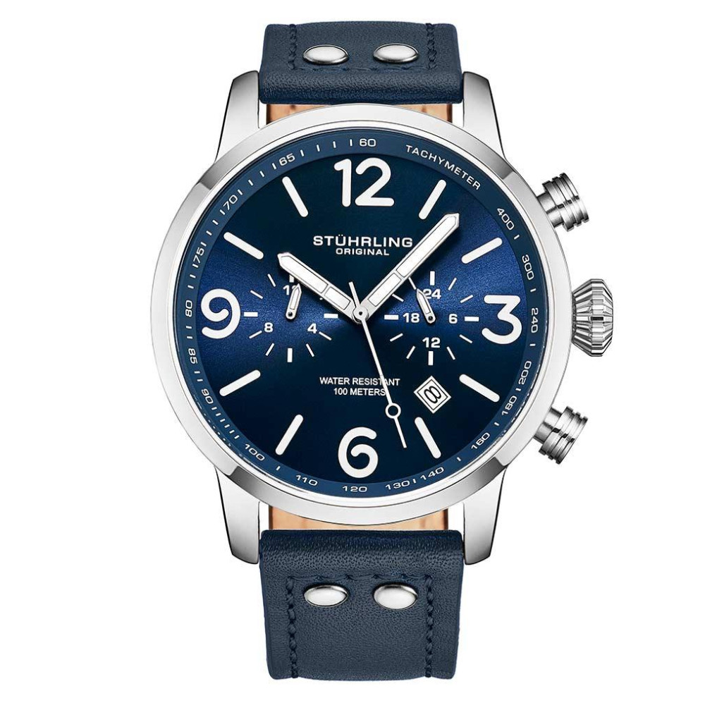 Relgio Stuhrling 3956 Aviador 45mm Mostrador Azul com Pulseira de Couro Azul e Fivela de Prata