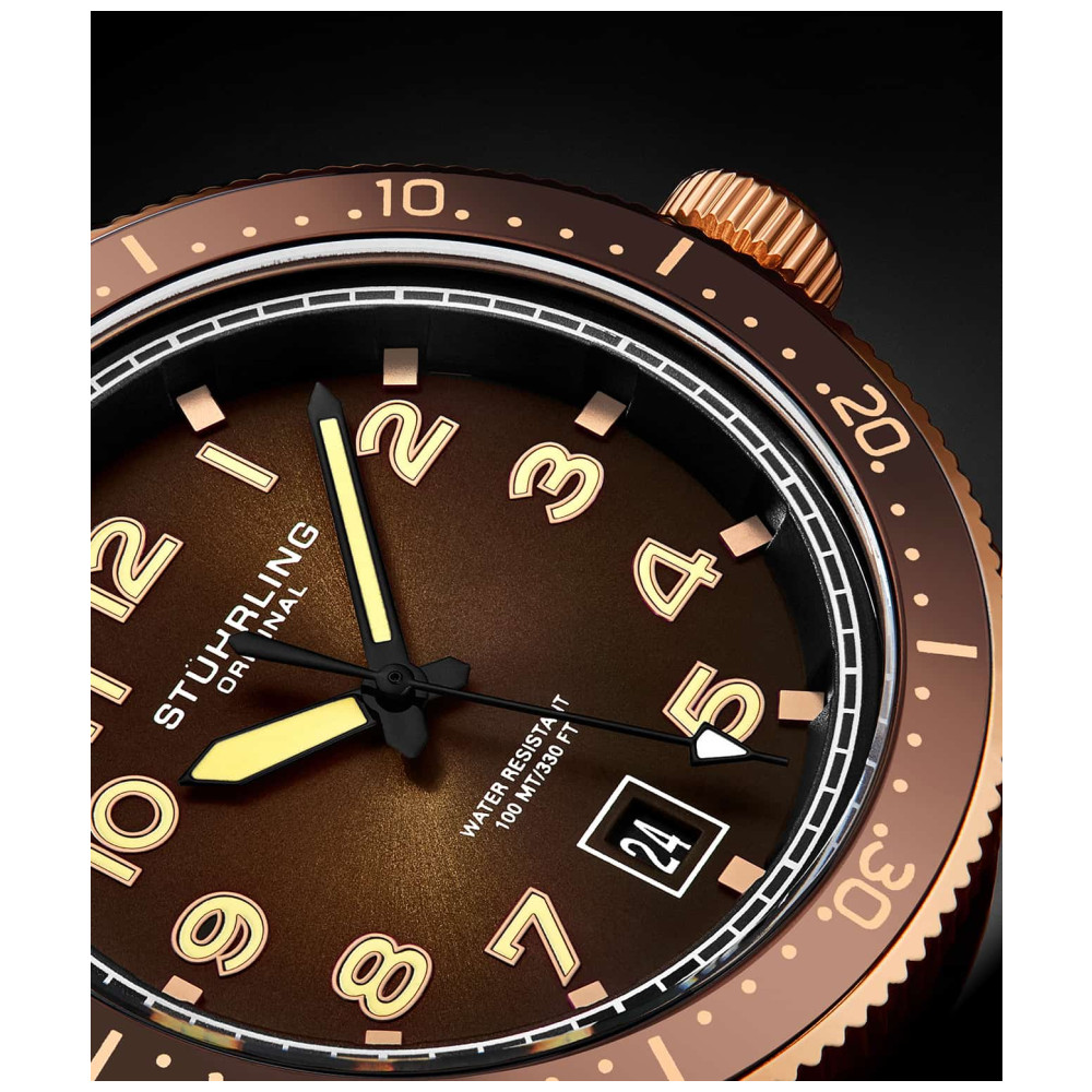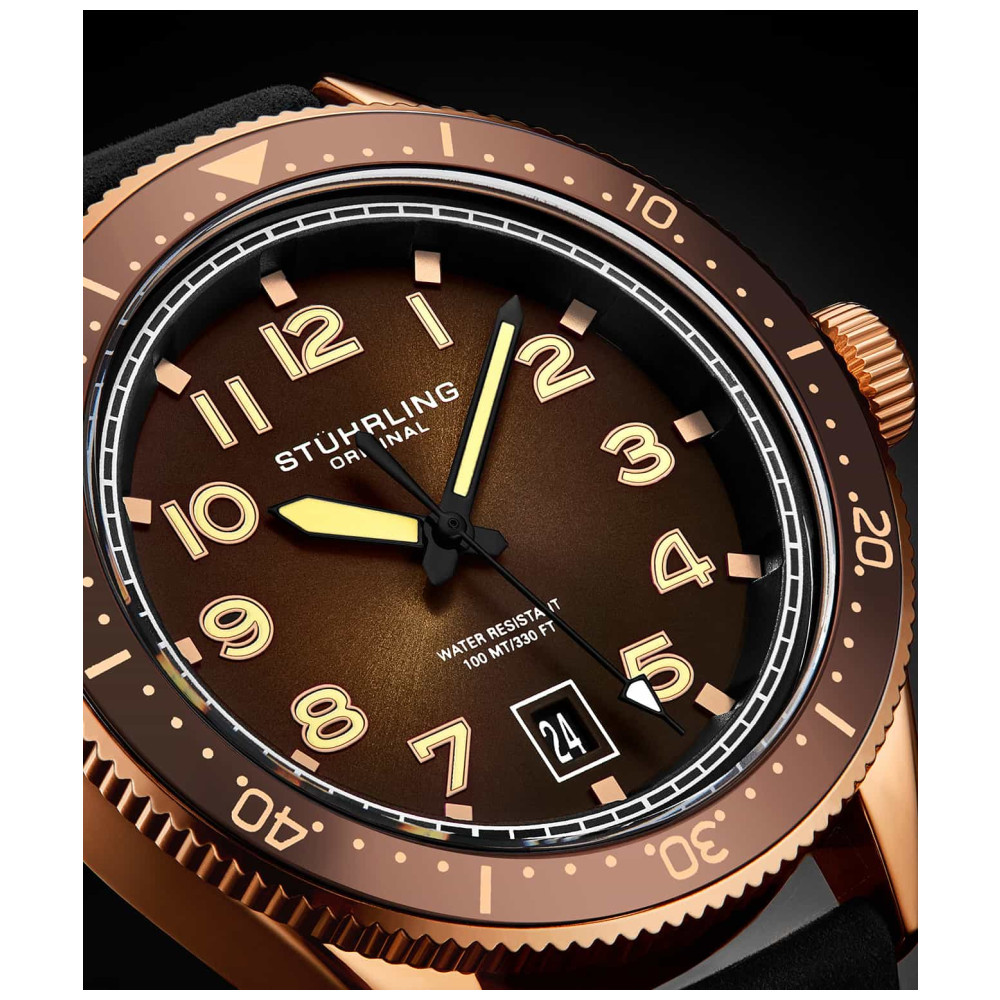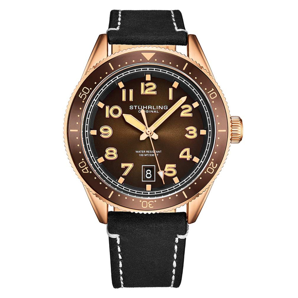 Relógio Stuhrling 42mm Mostrador Marrom Pulseira Couro Preta e Fivela Ouro Rosa – Elegância e Estilo