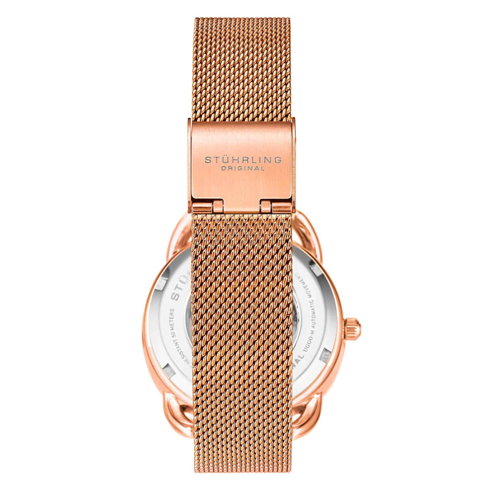 Relgio Stuhrling 3990M Automtico 36mm mostrador azul pulseira em ao inox rosa com fivela dobrvel em camadas de ouro rosa.