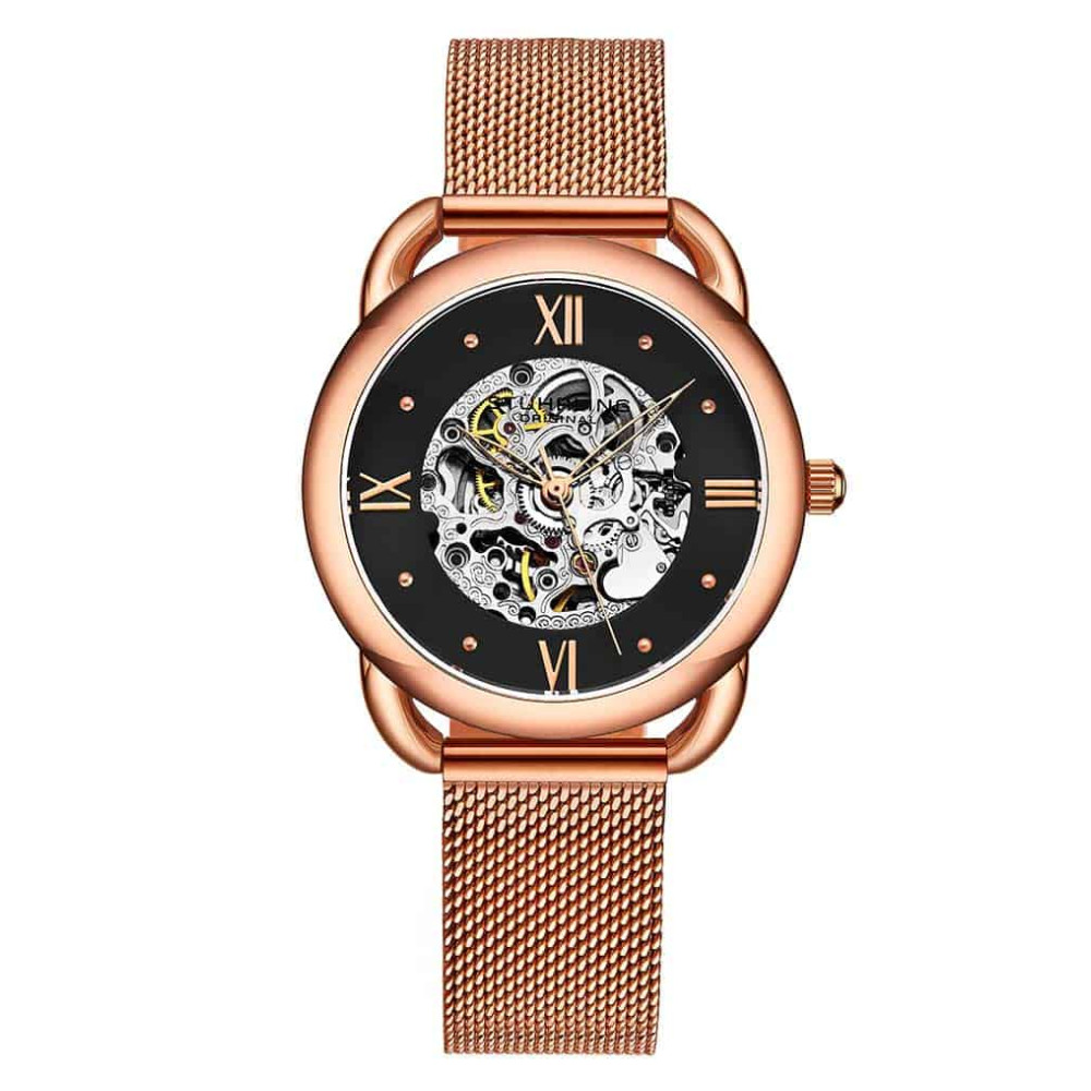 Relgio Stuhrling 3990M Automtico 36mm Mostrador Preto com Detalhes em Rosa e Pulseira em Ao Inoxidvel com Fivela Dobrvel em Ouro Rosa.