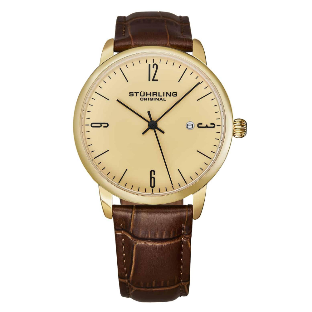 Relgio Stuhrling Classic 3997A com Mostrador Champanhe de 40mm Pulseira de Couro Marrom e Detalhes em Amarelo