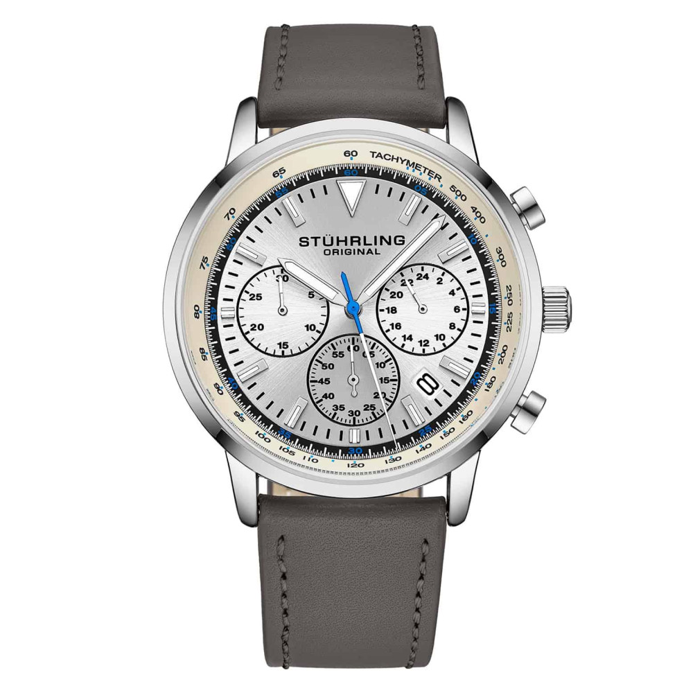 Relgio Stuhrling Crongrafo 44mm Prateado c/ Pulseira de Couro Cinza e Fivela Prata