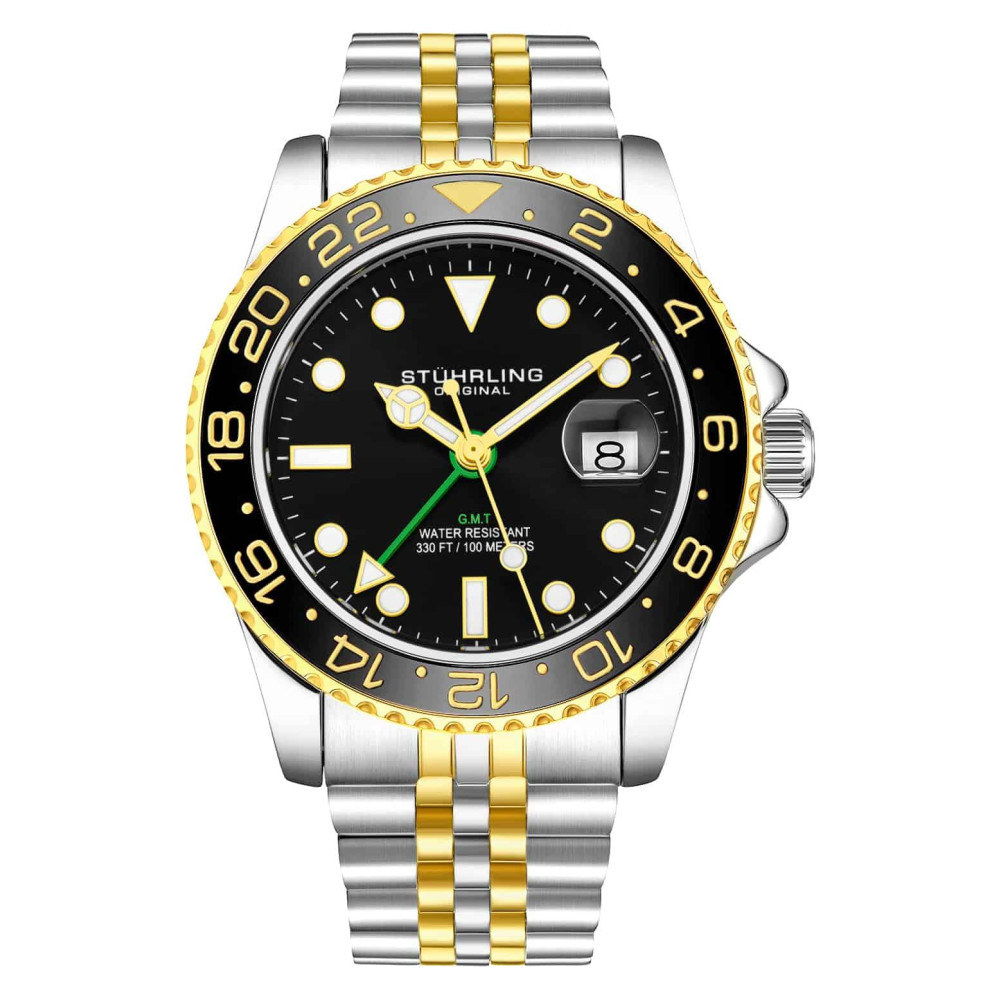 Relgio Stuhrling Meridian 3968 GMT 42mm Mostrador Preto e Pulseira de Ao Inoxidvel Dourada