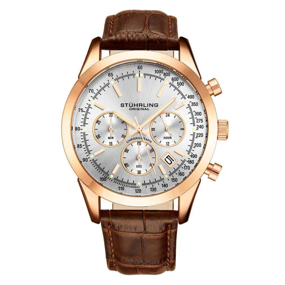 Relgio Stuhrling Rialto 3975L 44mm Crongrafo Prateado com Pulseira de Couro Marrom e Fivela Tang Rosa