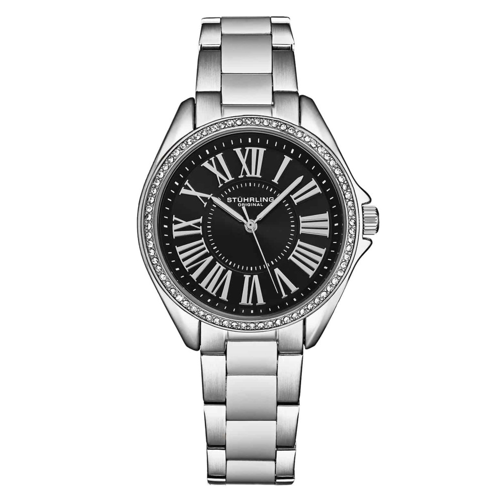 Relgio Stuhrling The Dynasty 4025 com moldura de cristal japons de 40mm e pulseira de prata – Mostrador preto elegante e sofisticado.
