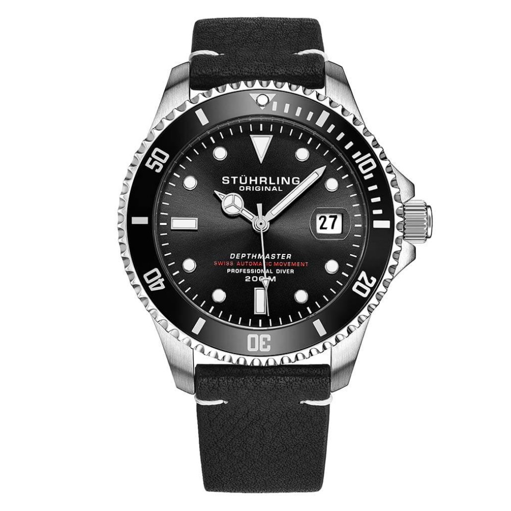 Relgio suo automtico Depthmaster 883 42mm mostrador preto/prata pulseira de couro preta prova d’gua – Stuhrling.