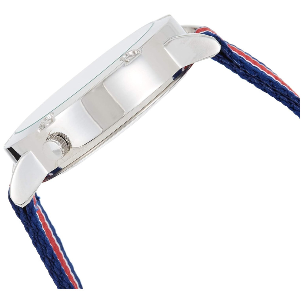 Relógio em tons de prata trabalhado com um mostrador branco grande equipado com uma pulseira de relógio de nylon vermelho, branco e azul Pinnacle de relógios de moda para estilo e durabilidade com uma face de vidro clássica Movimento de quartzo analógico Diâmetro da caixa 51mm Não à prova dágua.
