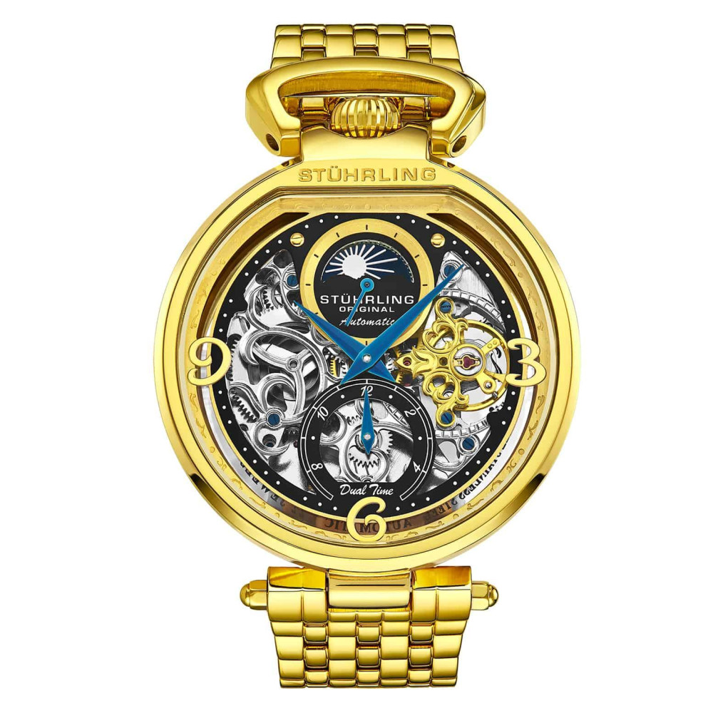 O Relogio Automatico Modena 4032 com Mostrador Preto e Pulseira em Aco Inoxidavel Dourada da Stuhrling e um modelo de alta qualidade que combina estilo e funcionalidade. Com um design esqueletizado, este relogio apresenta um mostrador impressionante que revela a complexa mecanica interna do relogio. Alem disso, a funcionalidade de hora dupla permite que o usuario rastreie facilmente dois fusos horarios, enquanto o indicador diurno e noturno oferece maior conveniencia e estilo. O fundo da caixa de exposicao mostra o movimento mecanico do relogio, proporcionando uma experiencia de cronometragem perfeita. Construido em aco inoxidavel com fivela implantavel, este relogio oferece conforto e ajuste seguro. E a escolha perfeita para o homem exigente que procura um relogio elegante e pratico.