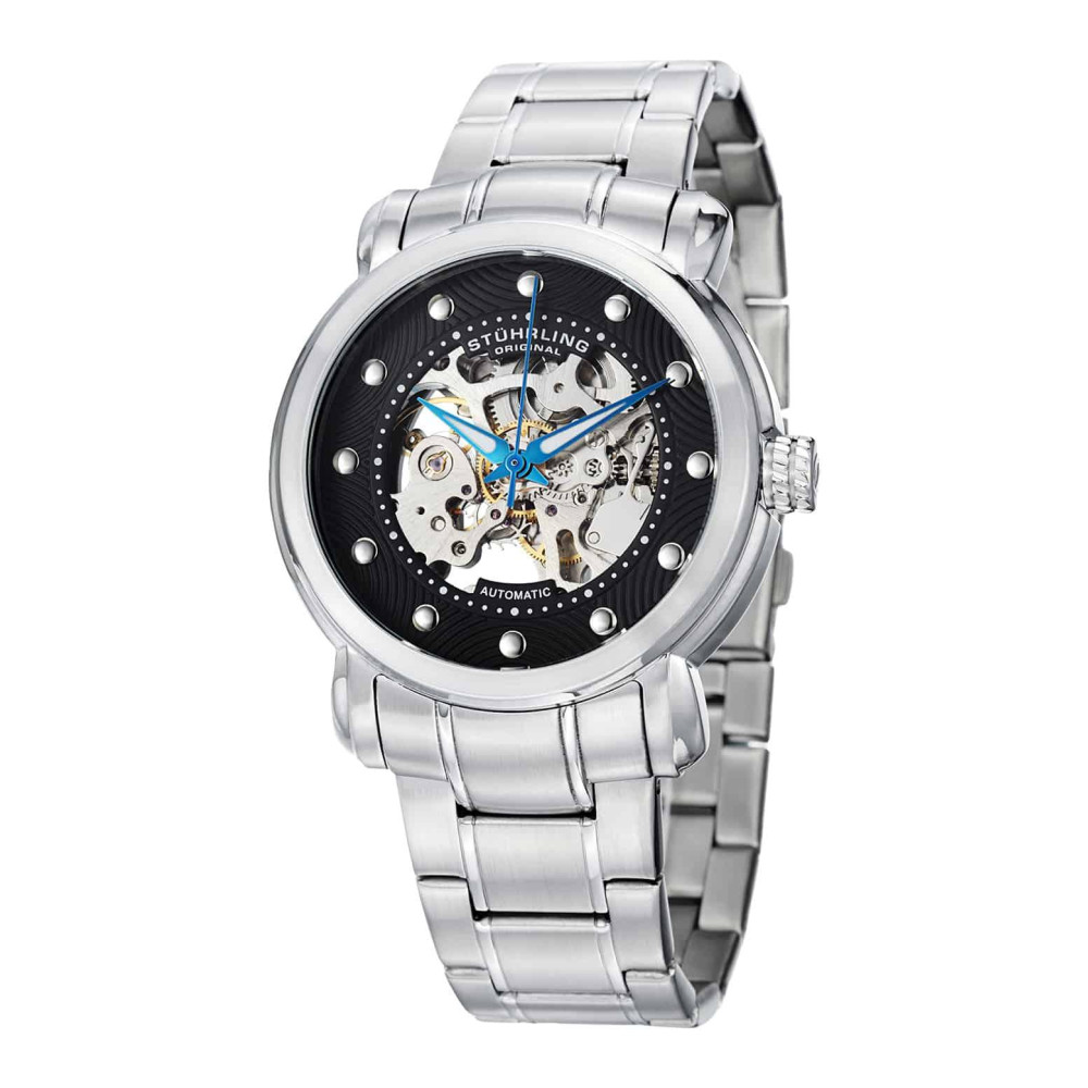 Relógio Automático Stuhrling 644 de 42mm com Mostrador Preto e Pulseira de Aço Inoxidável Prateado