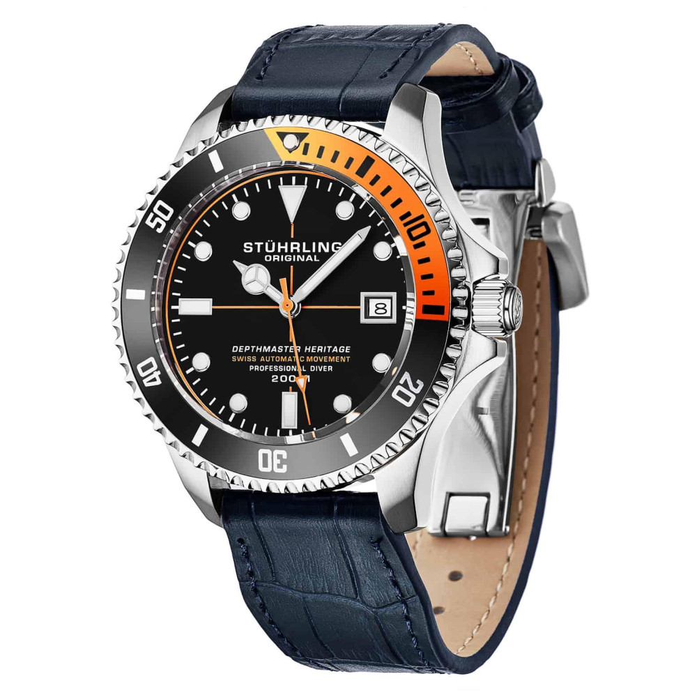 Relogio Automatico Swiss Depthmaster Heritage 883HL 42mm Mostrador Preto e Prata Pulseira de Couro Azul e Fivela Stuhrling.