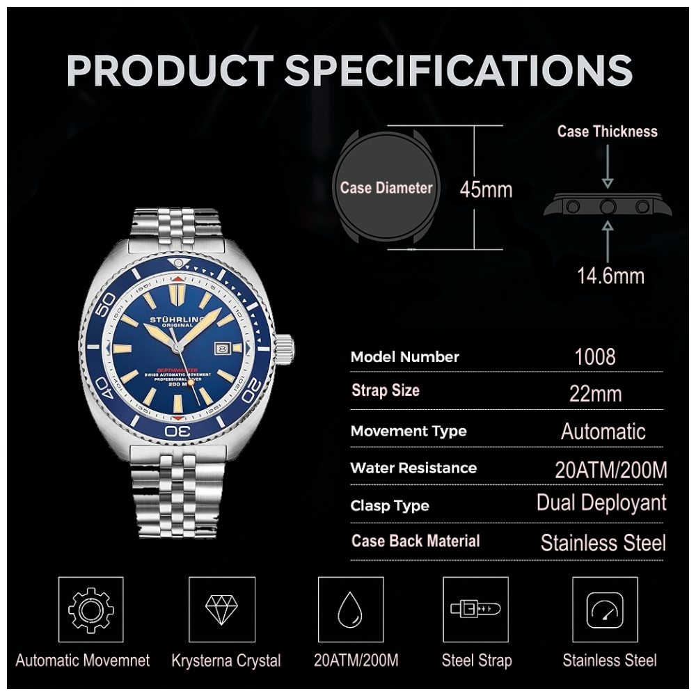 O relógio automático Depthmaster 1008 da Stuhrling é equipado com um movimento suíço preciso e confiável, garantindo que você nunca perca um compromisso importante. A caixa é robusta e durável, enquanto a pulseira de aço inoxidável adiciona um toque de sofisticação ao design. A cor azul da caixa e do mostrador acrescenta um toque de personalidade ao relógio, tornando-o uma peça única em sua coleção. Combinando estilo e funcionalidade, o Depthmaster 1008 é a escolha perfeita para quem procura um relógio confiável e elegante.