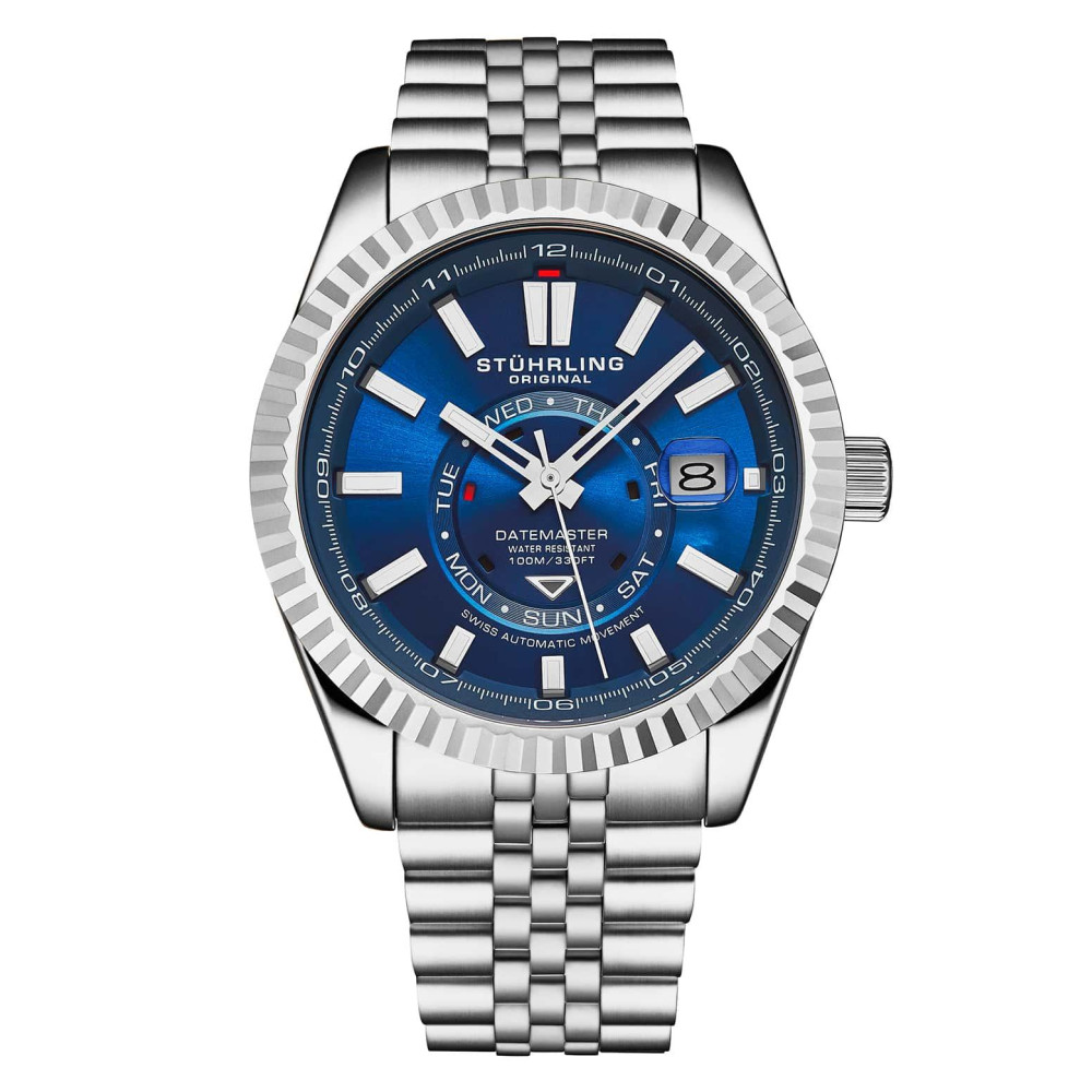 Relógio Datemaster Swiss Automático 1020 – Mostrador Azul e Pulseira Prateada – 42mm – Estilo Clássico com Moldura Prateada – Stuhrling.