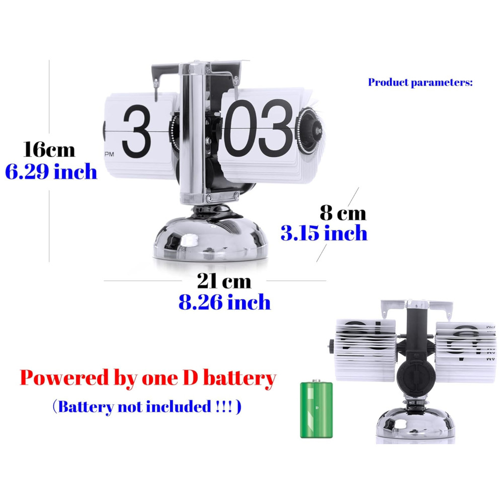 O relógio retro flip down é alimentado por um relógio D bateria, bateria não incluída, A vida útil média de uma bateria tipo D é de cerca de 5 a 6 meses.
