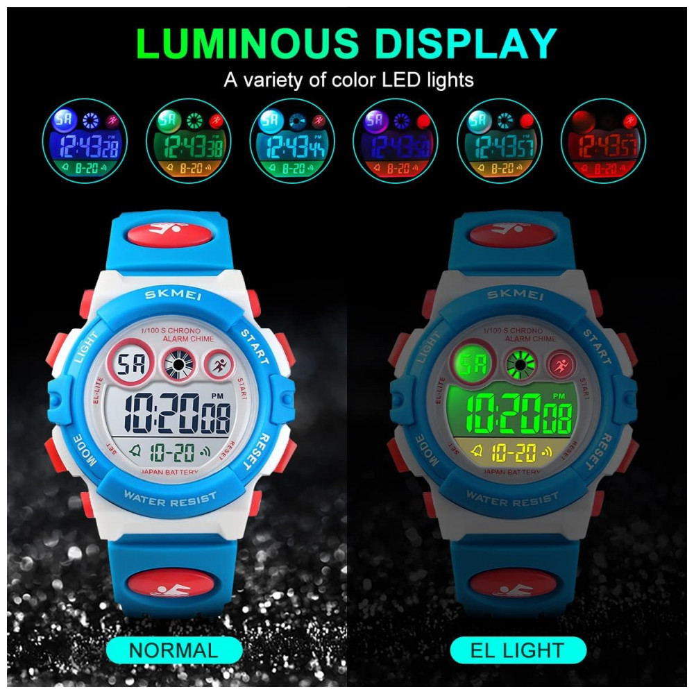 ESTILO ESPORTIVO Design de mostrador esportivo para crianças, perspectiva de estilo militar. Grandes números com luz, mostram o tempo claro no escuro. Use a lâmpada EL, pressione o botão LIGHT para ver a hora claramente na luz.