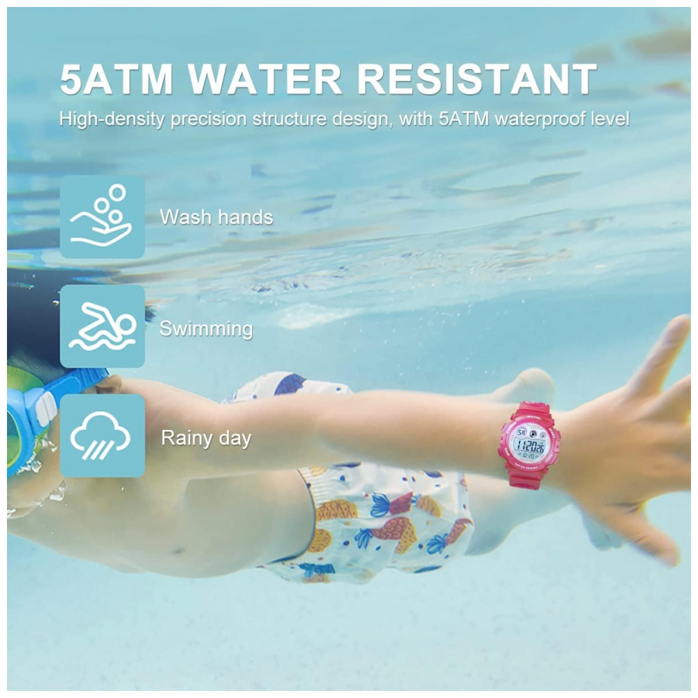 50M IMPERMEÁVEL 164Ft, 50M resistente à água, adequado para lavar as mãos, dia de chuva, suor e breve imersão em água. OBSERVAÇÃO NÃO pressione nenhum botão na água ou use este relógio para atividades subaquáticas de longa duração como mergulho, etc. Muito contato com a água ou uso em temperaturas extremamente quentes ou frias reduzirá a vida útil do relógio.