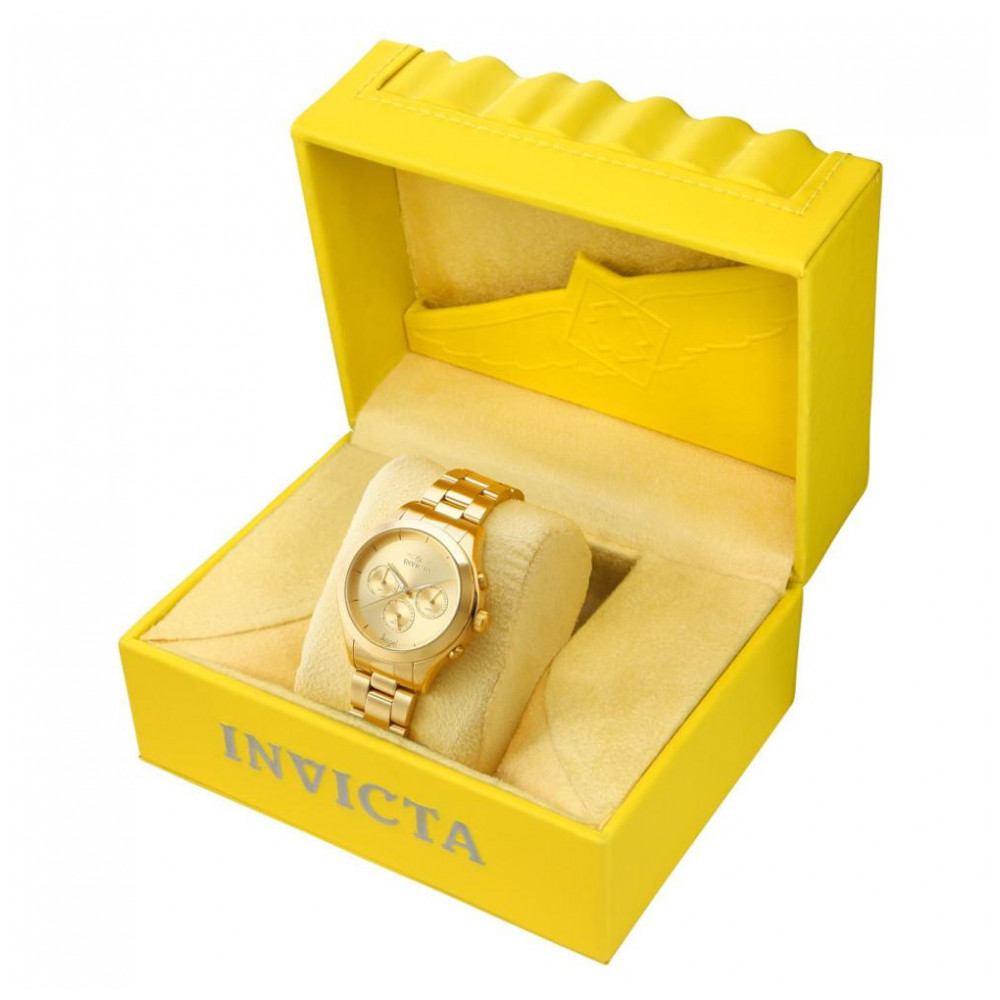 Este atraente relógio Invicta da coleção Angel é alimentado por um movimento de quartzo preciso, com uma caixa de ouro. Seu mostrador é decorado por um mostrador de metal dourado e protegido por um resistente Flame Fusion Crystal. Uma pulseira de aço inoxidável dourada completa este relógio que pode resistir à água por até 50 m.