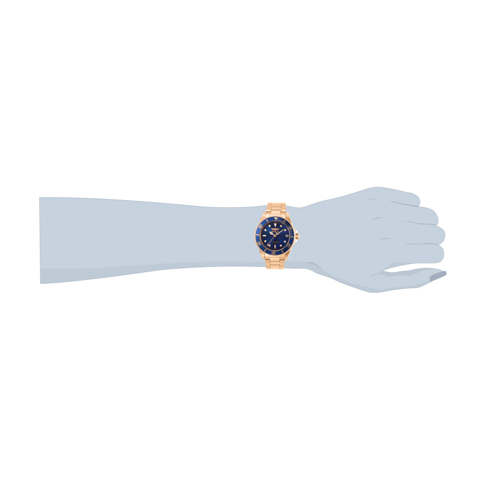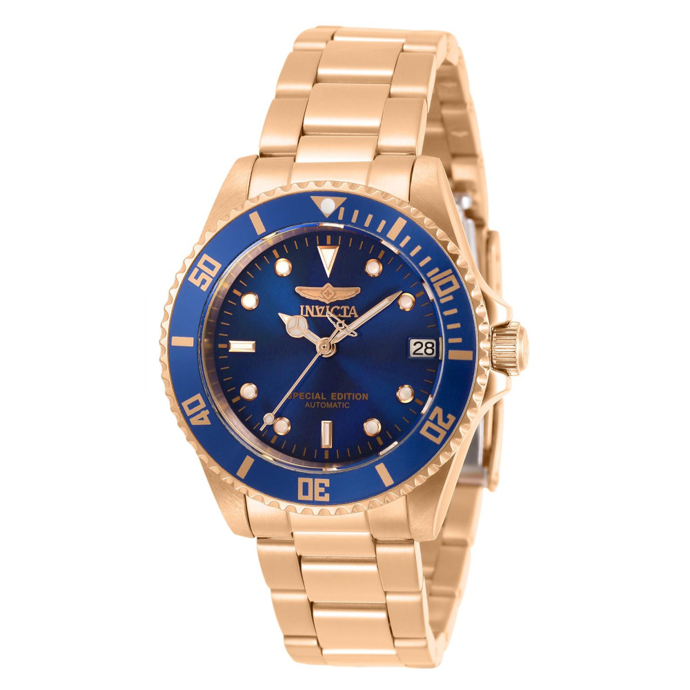 Este incrível relógio Invicta da coleção Pro Diver oferece um movimento automático exato, com uma incrível caixa em ouro rosa. O mostrador exibe um mostrador de metal azul protegido pelo nosso cristal mineral exclusivo. O design é completado por uma pulseira de aço inoxidável em ouro rosa. Este relógio pode resistir à água até 200 m.
