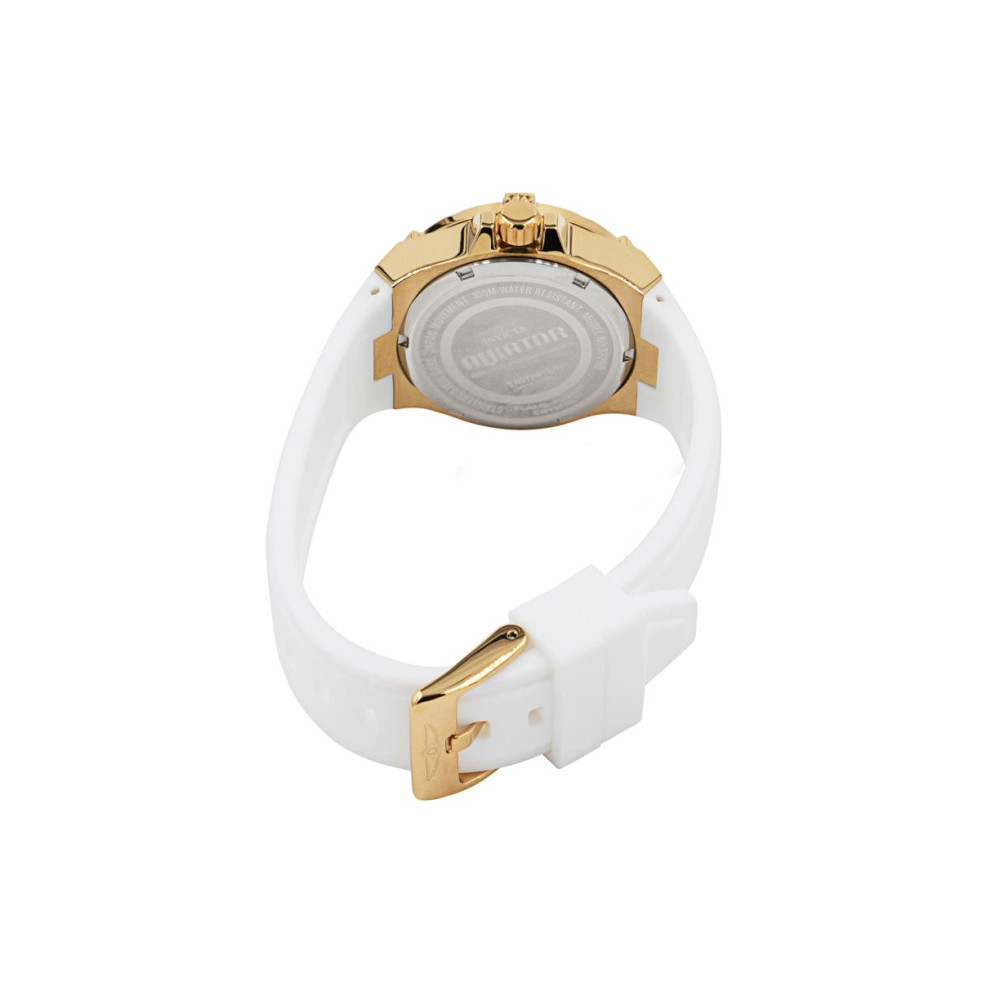 Este atraente relógio Invicta da coleção Aviator é movido por um movimento de quartzo preciso, com uma caixa dourada. Seu mostrador é decorado por um mostrador de madrepérola de metal e protegido por um resistente Flame Fusion Crystal. Uma pulseira de silicone branca completa este relógio que pode resistir à água por até 100 m.