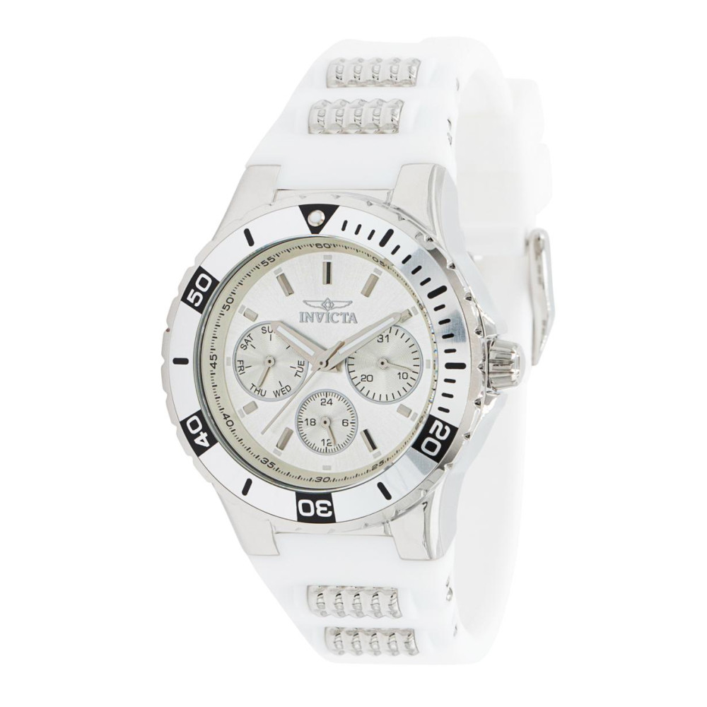 Este belo relógio Invicta Aviator contém um movimento de quartzo preciso, além de uma caixa de aço. Seu mostrador exibe um mostrador de metal prateado protegido por um Cristal Flame Fusion de alta resistência. Este relógio é completado por uma pulseira de aço, branco, aço inoxidável e silicone e oferece resistência à água de até 100 m.