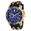 Este lindo relógio Invicta Pro Diver contém um movimento de quartzo preciso, além de uma caixa de ouro. Seu mostrador exibe um mostrador de metal azul protegido por um Cristal Mineral de alta resistência. Este relógio é complementado por uma pulseira de ouro em aço inoxidável e oferece resistência à água de até 100 m.